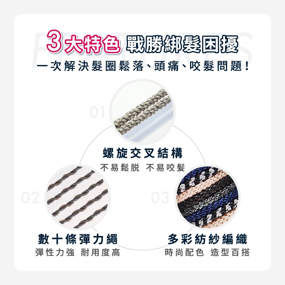 由數十條強韌的彈力繩與紡紗螺旋交錯編織而成,厚實彈性佳且不易斷裂,超過30種顏色選擇,隨時隨地都能輕鬆使用。居家、辦公、休閒活動、戶外運動、重訓有氧都能牢牢綁住馬尾!