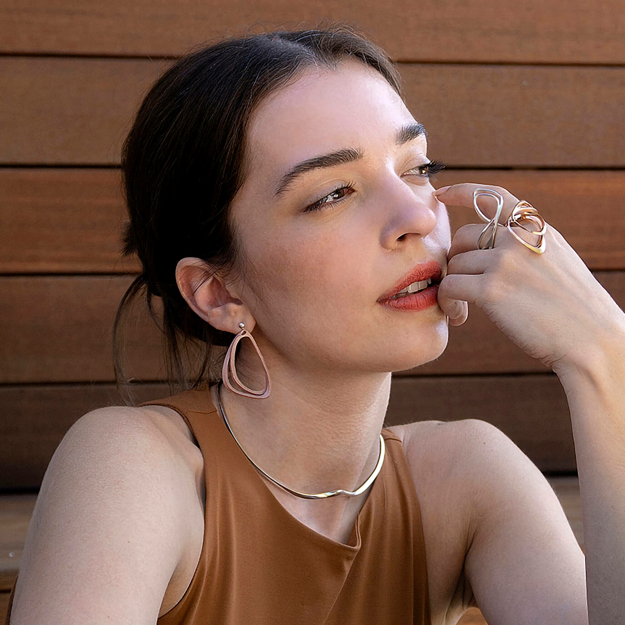 這款Aura耳環由209層碳纖維堆疊構成,配戴時它會輕盈而優雅地垂落在您的下顎旁,適合日常全天佩戴。