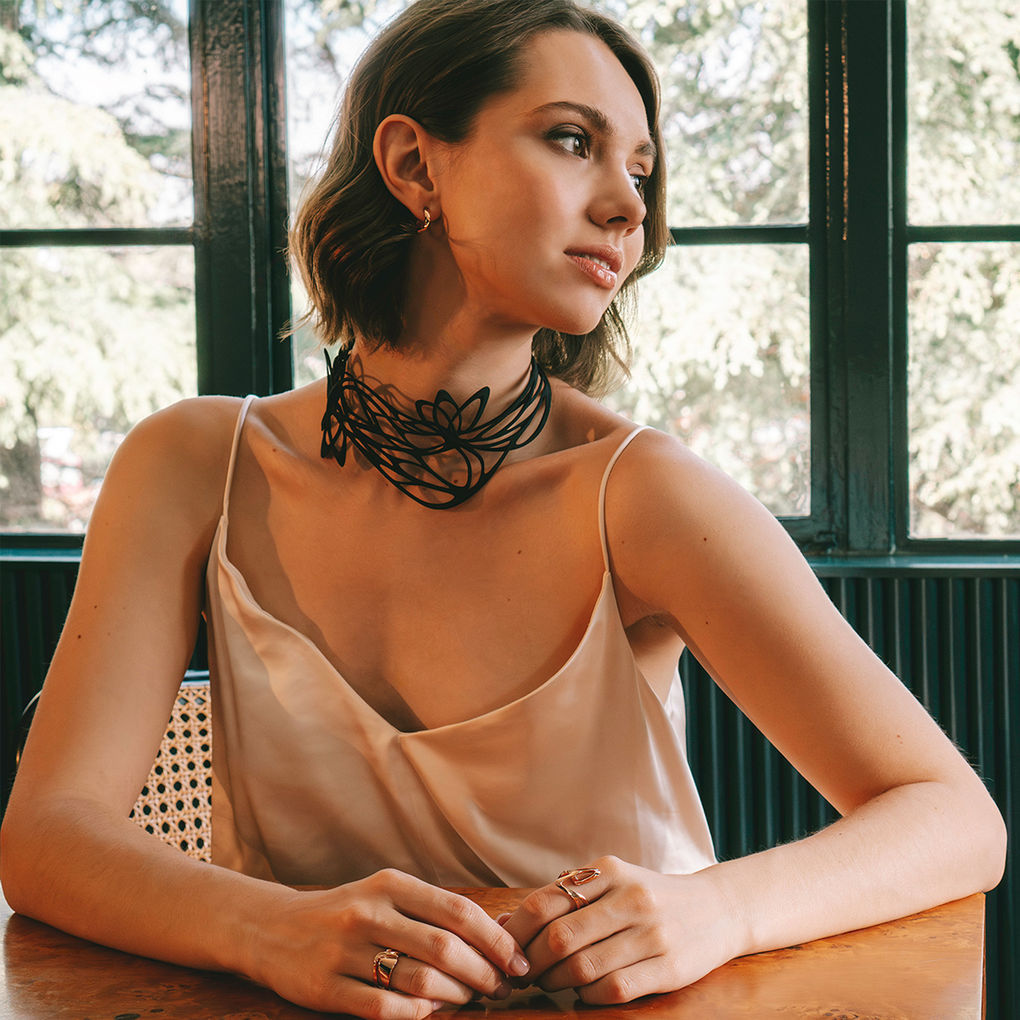 流暢的波紋曲線縈繞在頸間,採用LACE標誌性的堆疊手法,柔和而抽象的線條與銳利而精確的邊緣細節成就了這款優雅的項圈。
