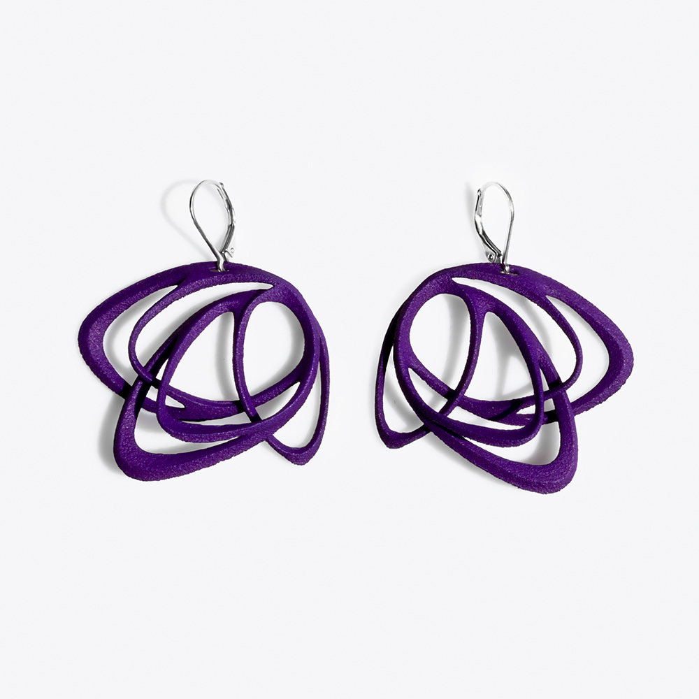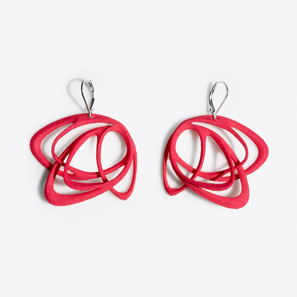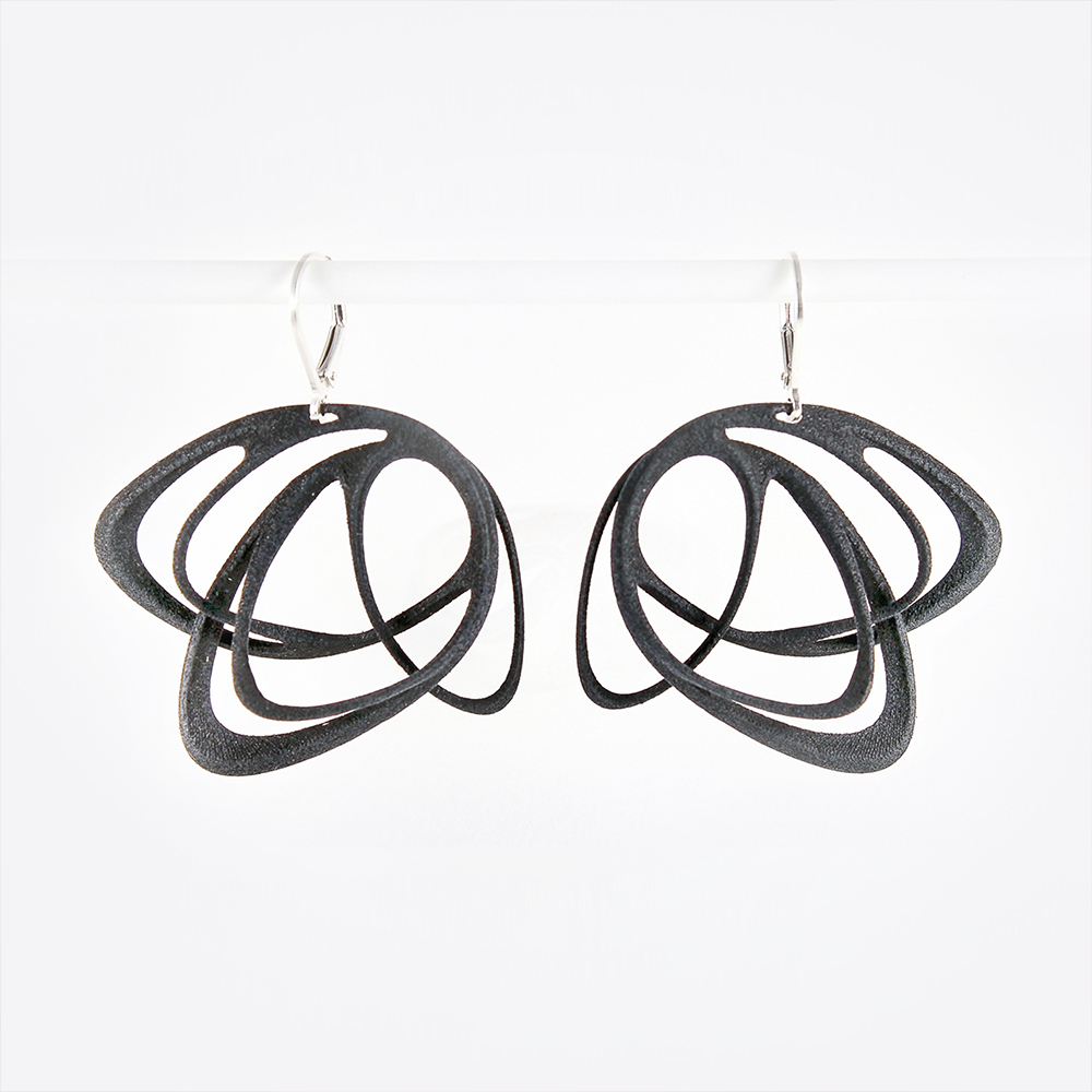 富有造型的尼龍材質的耳環僅不到5公克的重量,搭配純銀的槓桿背耳鈎,亮眼且配戴舒適。