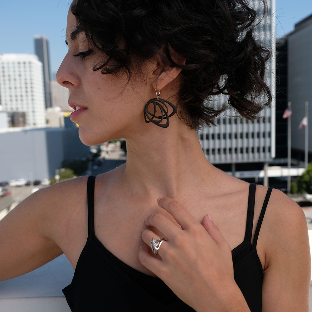 Gemino耳環是由LACE標誌性的三片互鎖橢圓形「花瓣」造型而成。 構成花瓣的線條們輕盈而動感地交錯,形成了精緻而凝聚的組合。 我們精心設計了掛鉤的位置,將其偏離了中心點,讓整個耳環的重心懸掛在其中一片花瓣的邊緣。 這種設計帶來的線條加粗和微妙的外傾,賦予了耳環輕盈而靈活的感覺。