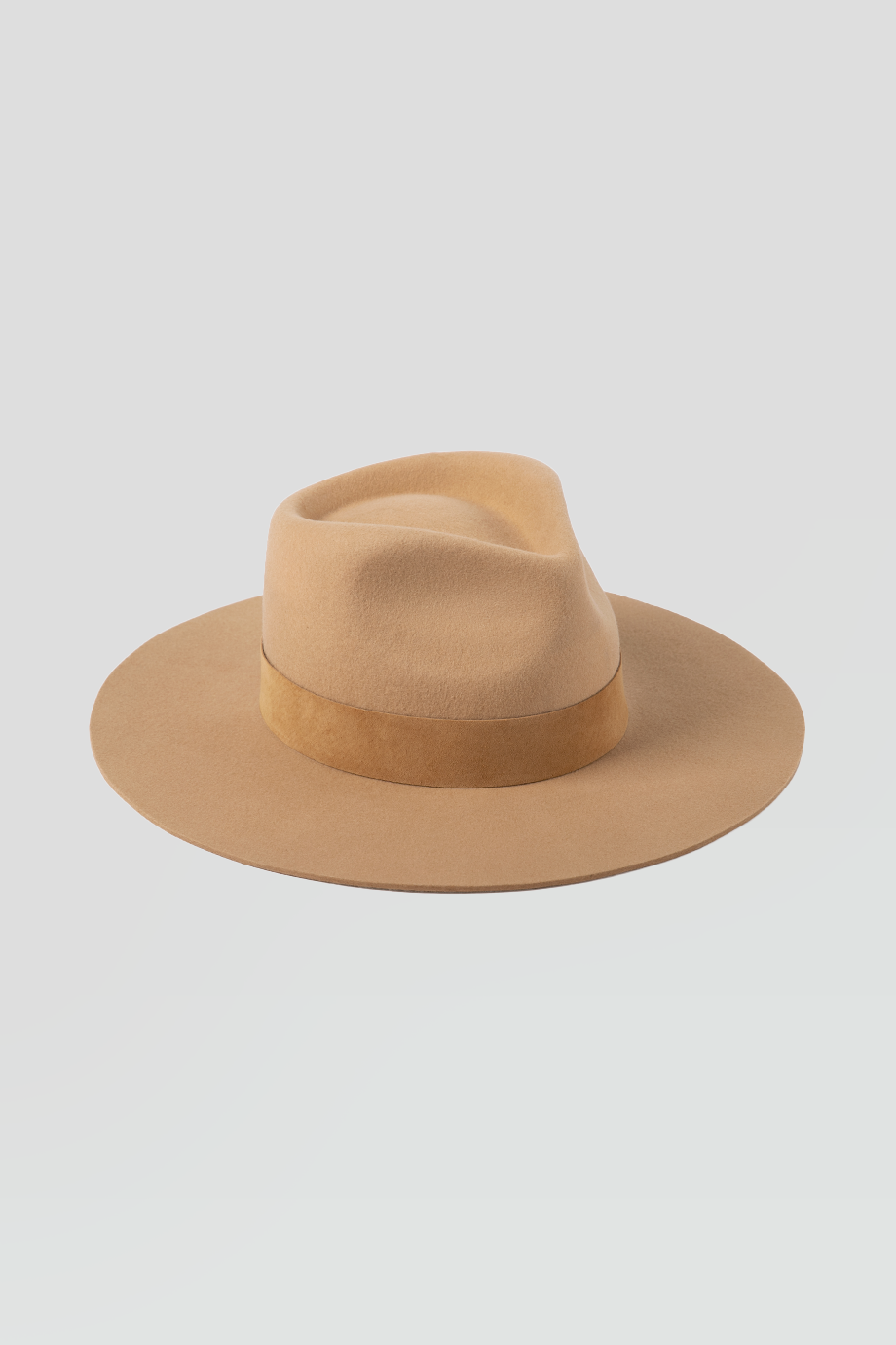 THE MIRAGE CARAMEL 麂皮絨面緞帶紳士帽採用全新的復古風格輪廓,並飾有柔軟的同色系麂皮絨面緞帶,是款經典百搭單品。