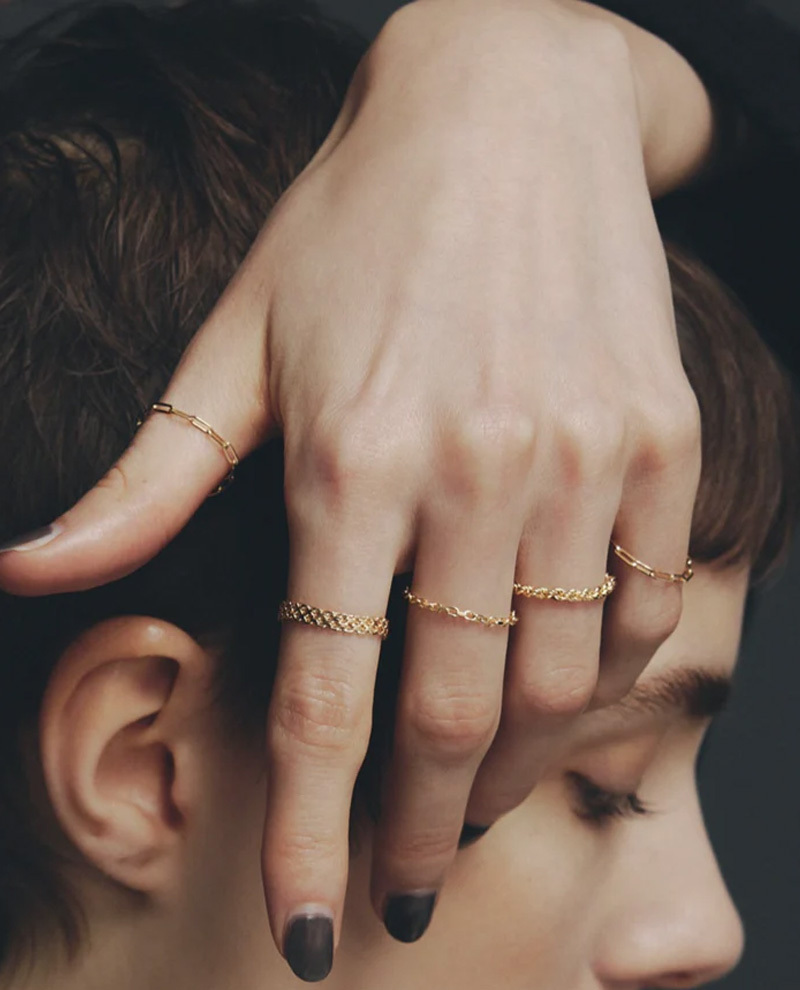 鍊戒採用細長的方形切割鍊條,賦予其現代氛圍和閃閃發光的黃金色澤。