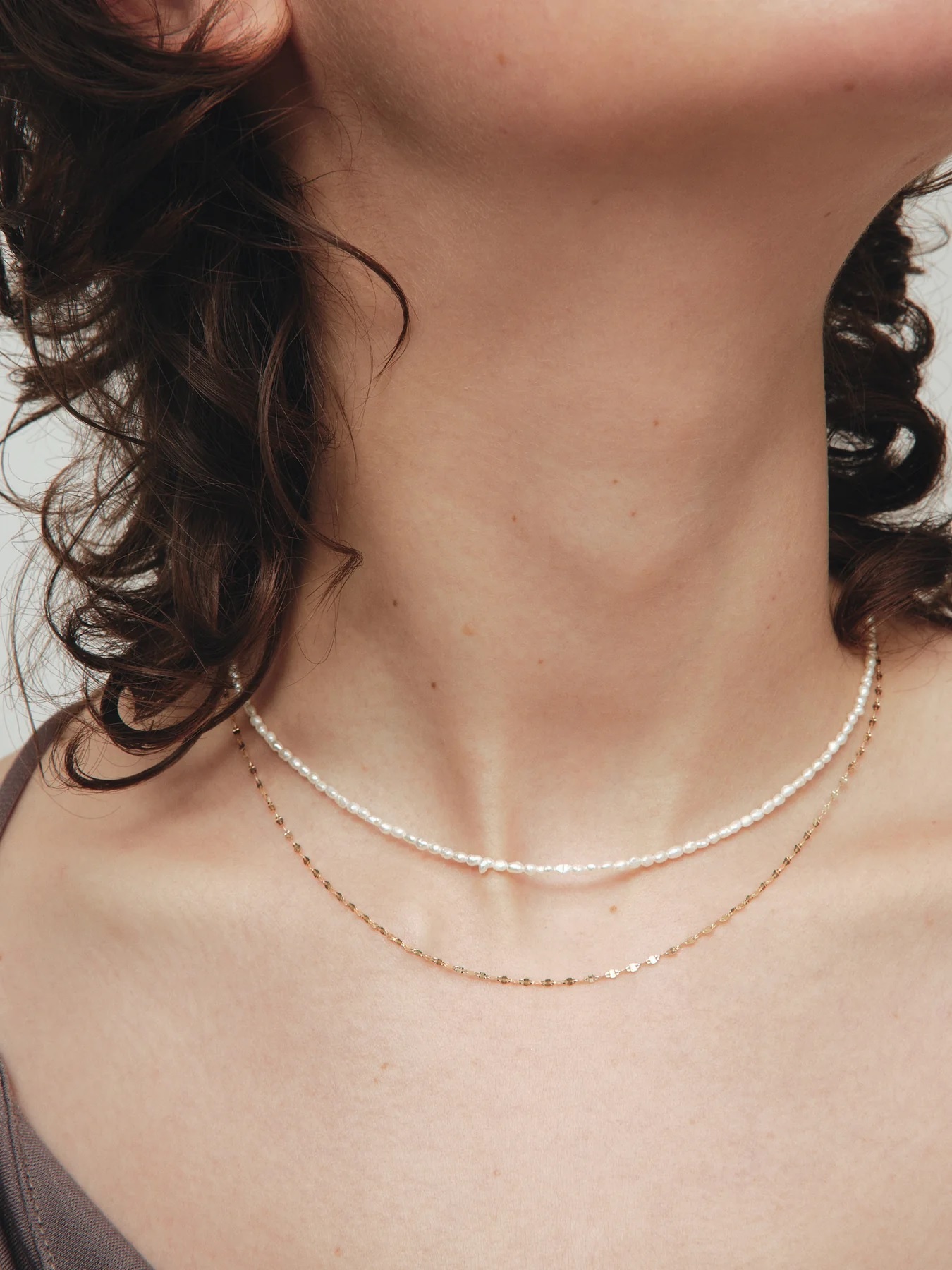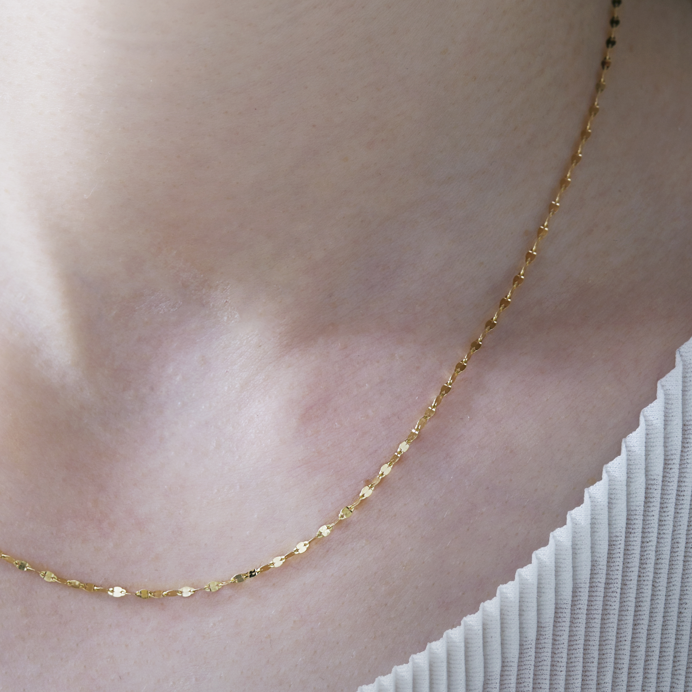 散發女人味且能使肌膚顯得明亮的玫瑰金項鍊為臉龐帶來活潑的光采。