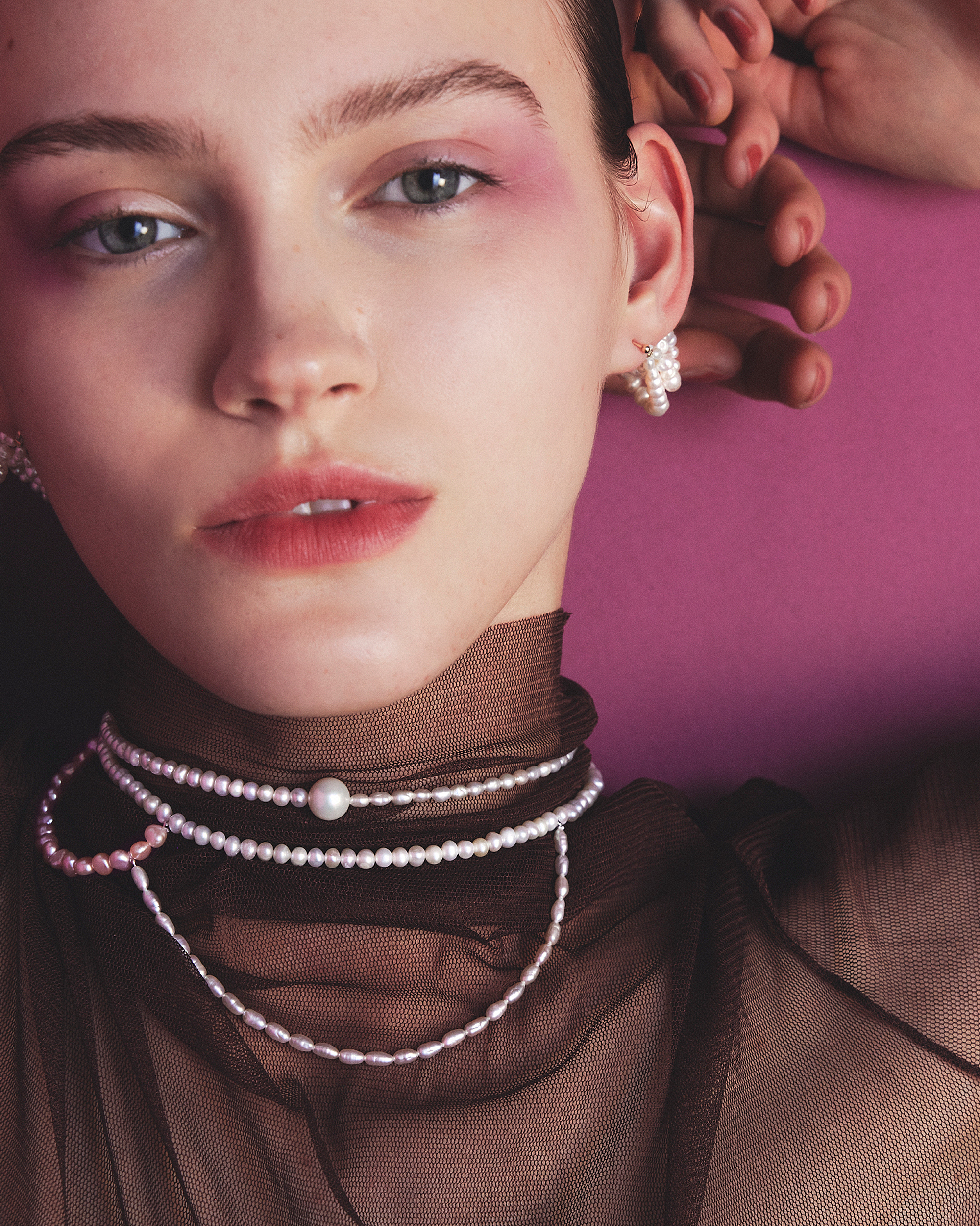 ●水潤淡水珍珠與彩色珍珠交錯串連,展現隨性又富玩心的藝術風格