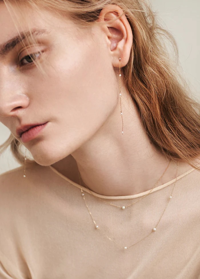在單顆小巧的鑽石耳環上,連接串連珍珠鍊條的獨特設計。