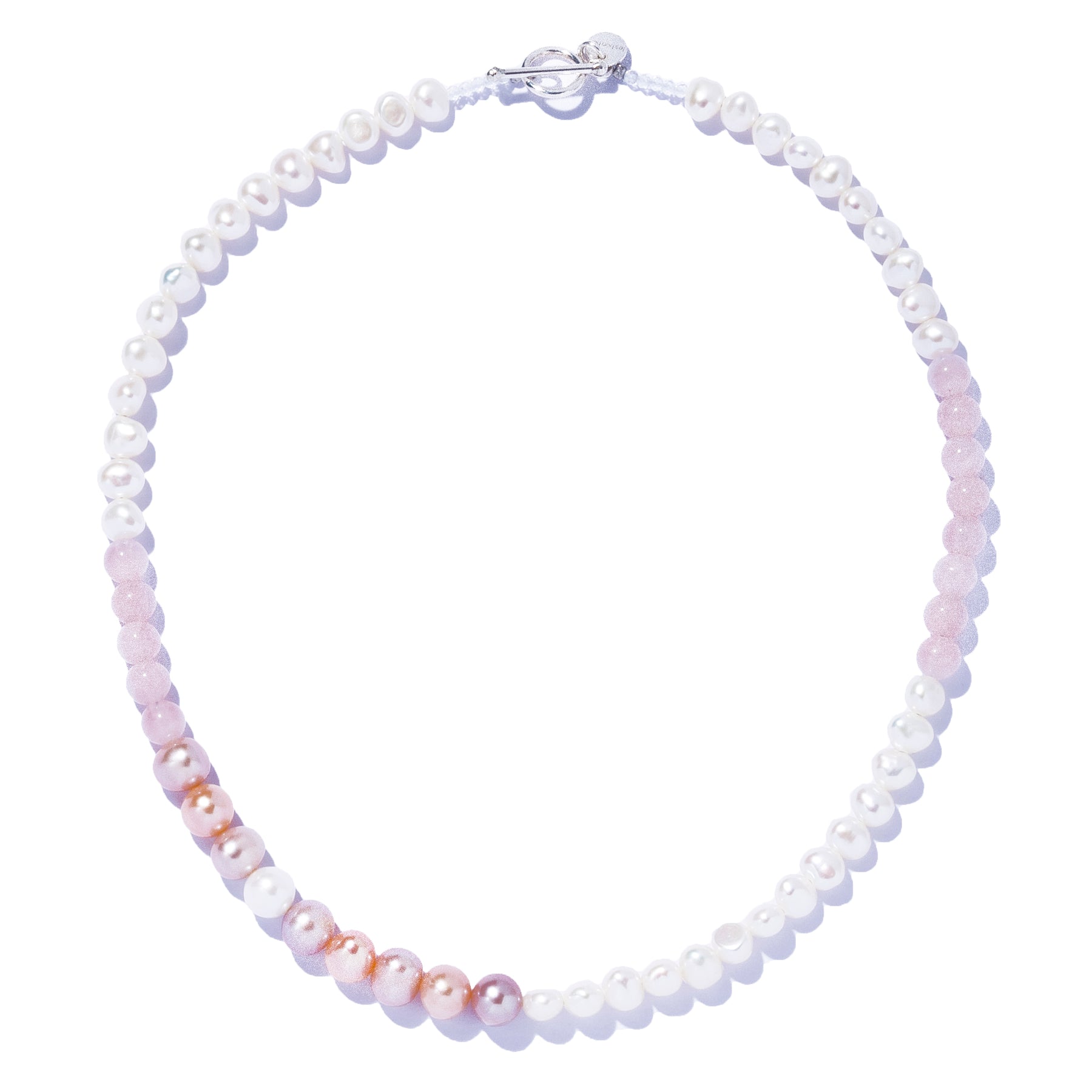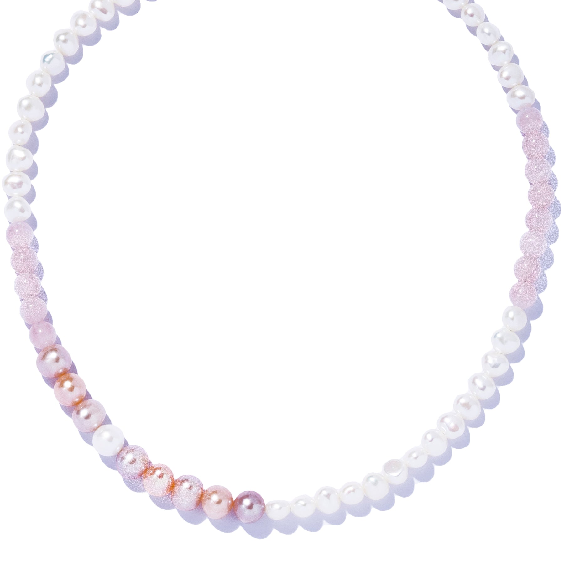 玫瑰晶與淡水珍珠散發純淨柔和的光澤,而粉紅珍珠則帶來一抹生命力與溫柔的力量。