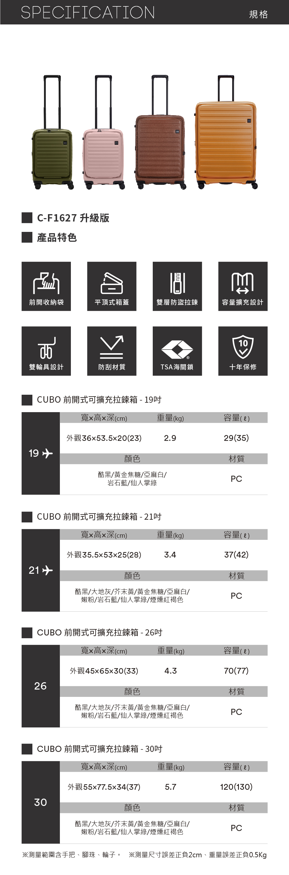 CUBO系列採用前開式設計,中間為擴充圍,不同於一般對開式行李箱,開闔時只需要極小空間,讓您不管在任何環境都能輕鬆整理行李