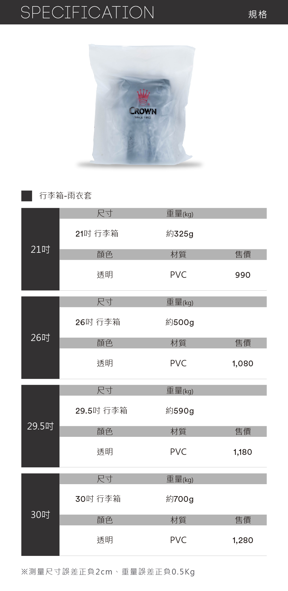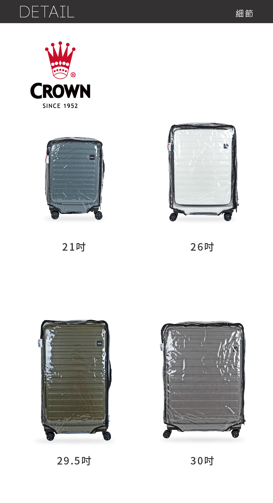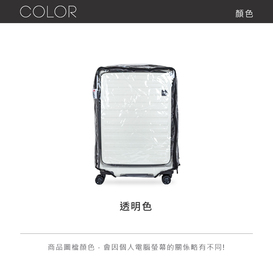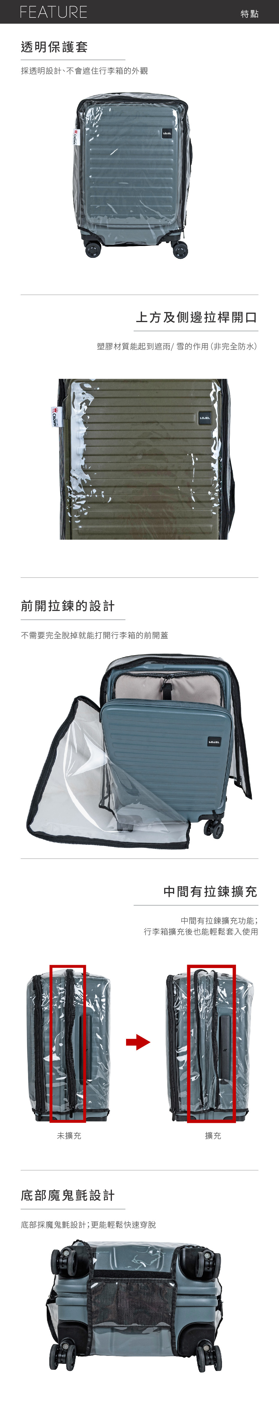 專門為前開式行李箱製作而成的透明保護套,塑膠材質能起到遮雨/雪的作用(非完全防水),前開拉鍊設計、中間有拉鍊擴充功能、底部魔鬼氈設計