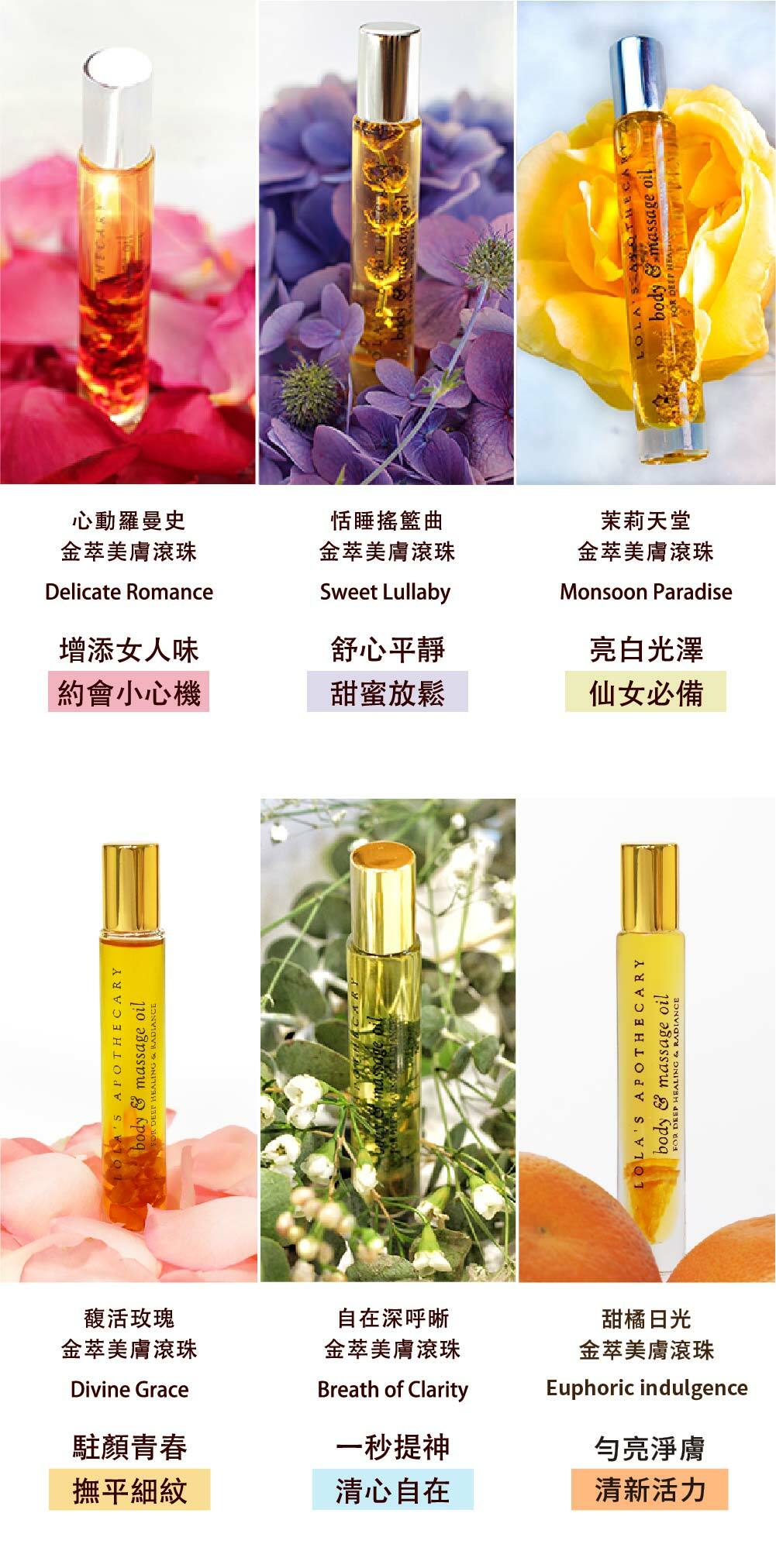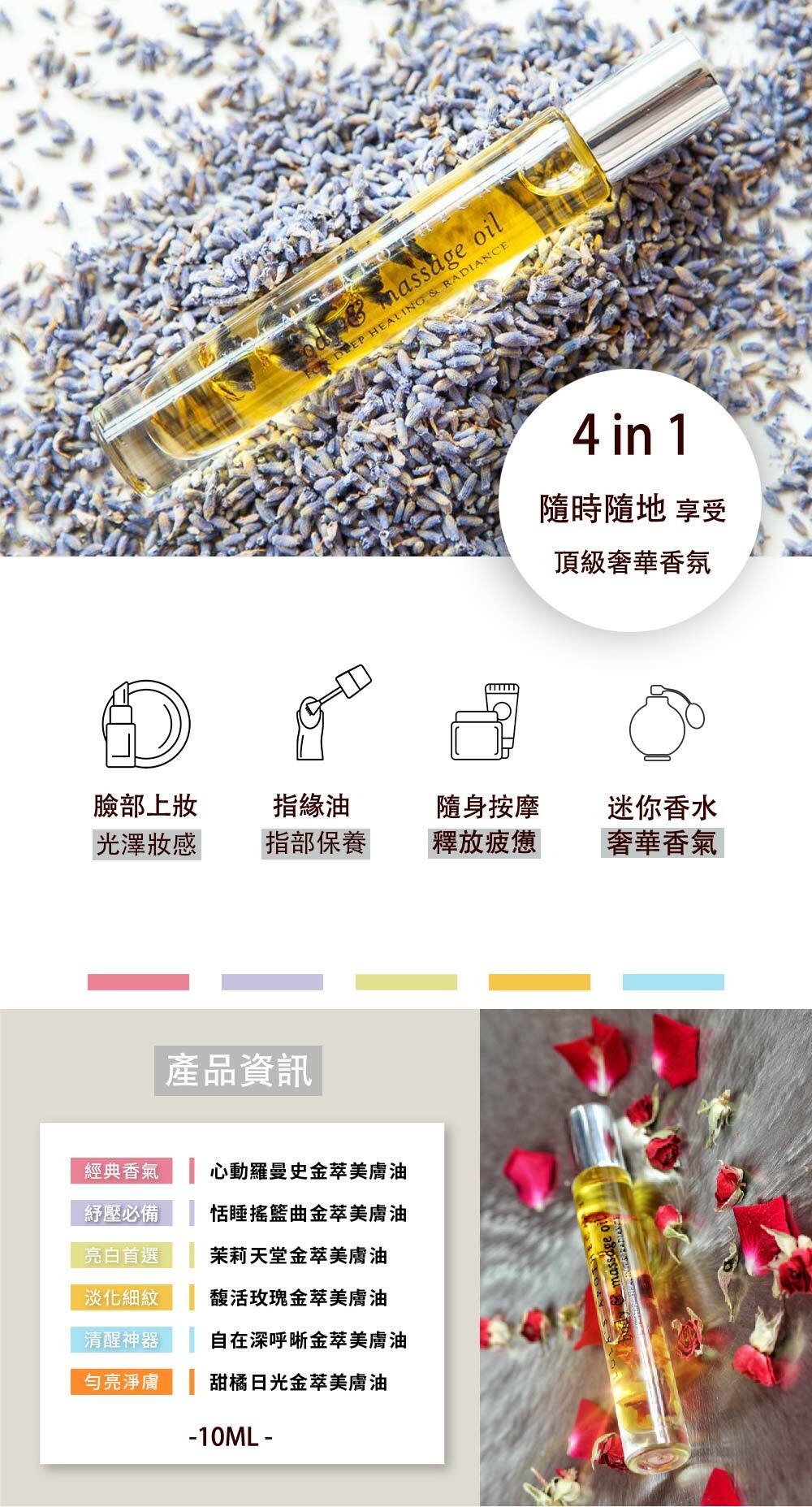 「金萃美膚滾珠系列」一次擁有 4 in 1功效,光澤臉部保濕、芳療滾珠按摩、指緣保養、隨身香氛補充