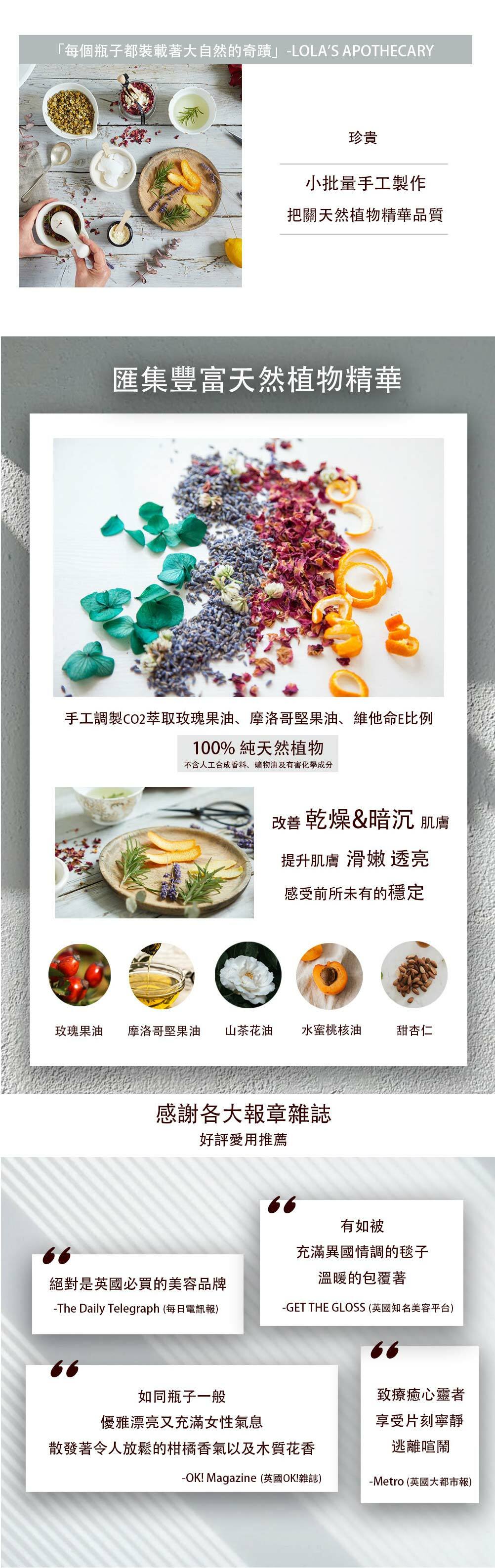英國頂級品牌LOLA'S APOTHECARY,榮獲英國Beauty Shortlist Awards肯定。每項產品皆由工藝師手工製作,精心調製的天然配方,確保植物精華的品質無虞,打造美麗又優雅的藝術品。
