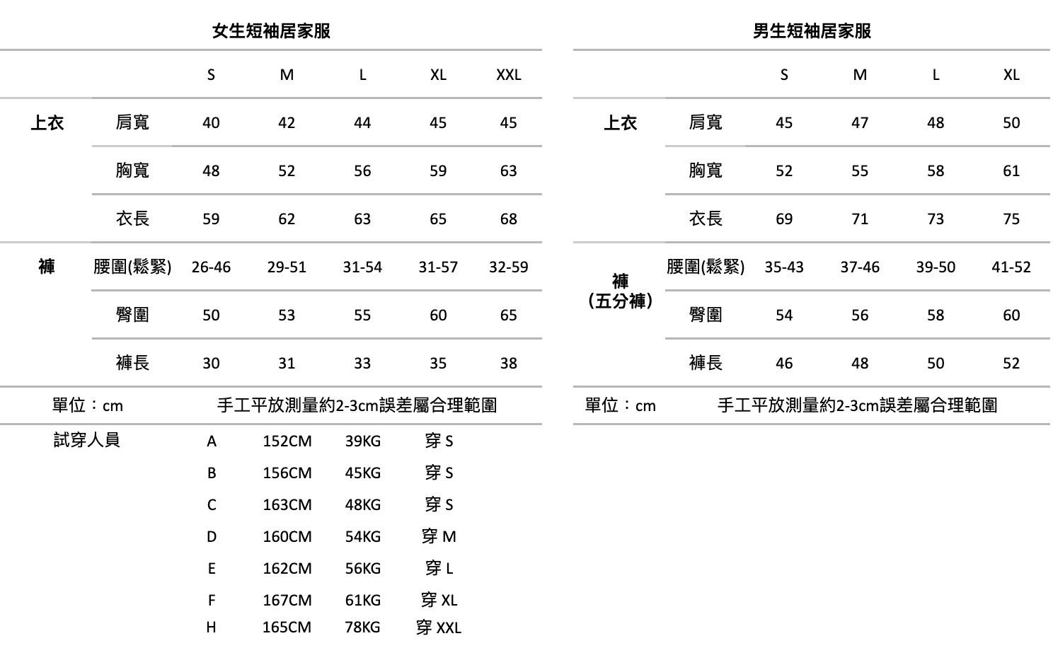 居家服皆分為上衣下身兩件式套裝販售,衣褲尺寸相同不拆賣。