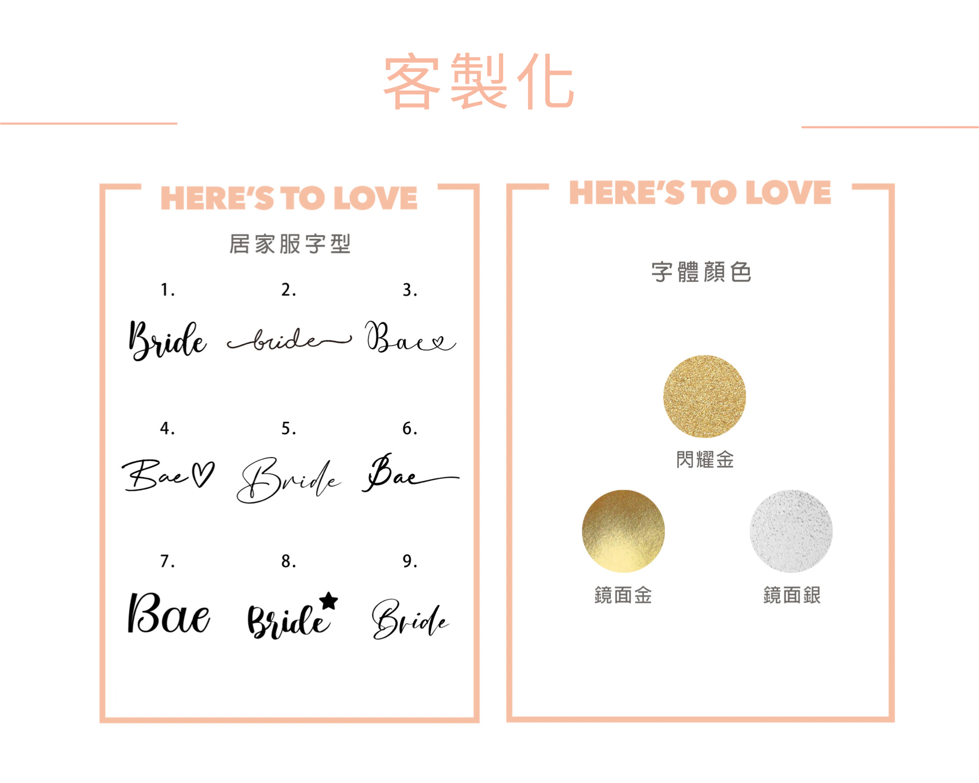 *若需客製化商品請於備註欄內填入『 1.字型 2.字體顏色 3.客製化內容』(Ex: 1.#3 2.閃耀金 3.Bae)