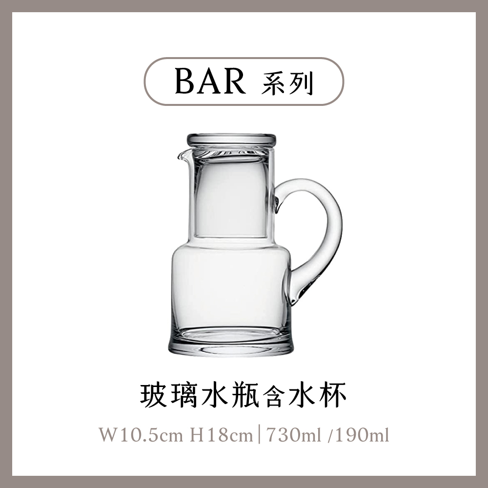 經典又品項完整的BAR系列,由技藝高超的玻璃吹製工匠口吹製成,這系列帶有厚實的圓盤底座但又不失優雅,水瓶搭配由手工連接成型的手柄,這系列適合在各種場合中使用,為飲品增添一份特殊的品味。