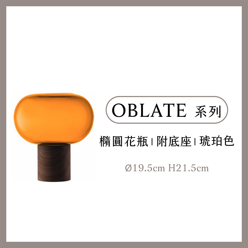 將透明和琥珀色玻璃口吹成扁橢圓狀的球形器皿,底座由美國胡桃木製成,並使用食品安全油處理,若花卉植物是帶有柱狀根莖,亦可直接插入核桃木底座。適用於作花瓶、燭台、花盆或餐盤器皿使用; 或作為家居擺飾,展現簡約自然、澄淨剔透的居家美學。
