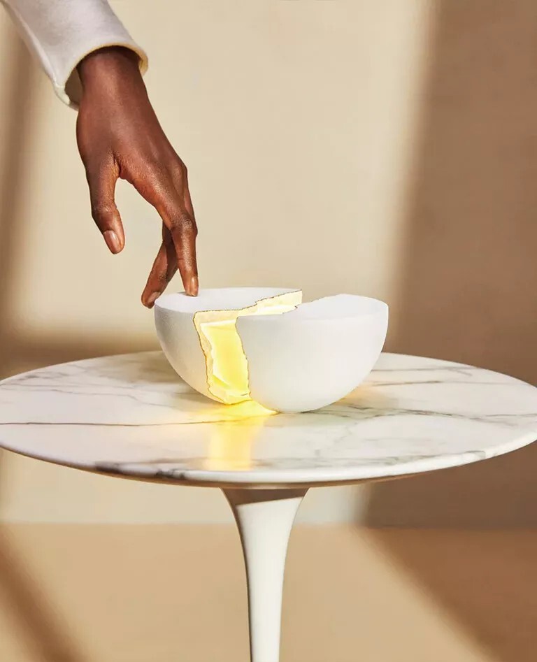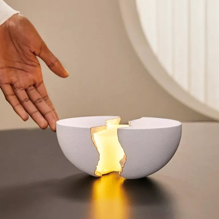 創辦人 Max 設計 Teno 的靈感很大一部分來自旅行日本時受到傳統工藝「金繼」(Kintsugi)的啟發。「金繼」是一種源自日本的古老修復技術,主要使用漆料來修補破損的陶瓷器具,再用金粉、金箔等材料加以美化修補的痕跡,讓物品不僅恢復功用,也轉變成一個獨特藝術作品。 Teno 如石頭般的外觀表面由沙子和樹脂的混合材料製成,賦予堅固而獨特的磨砂質感;從中撥開將從裂縫中透出暖白色的燈光,呼應了金繼工藝裡的修補線條。Max 希望 Teno 能像家中的收藏品一樣:有著隨時間增長越具價值且不會輕易隨時間汰換的特質;帶有不完美的裂痕,卻如「金繼」一樣經典恆久。