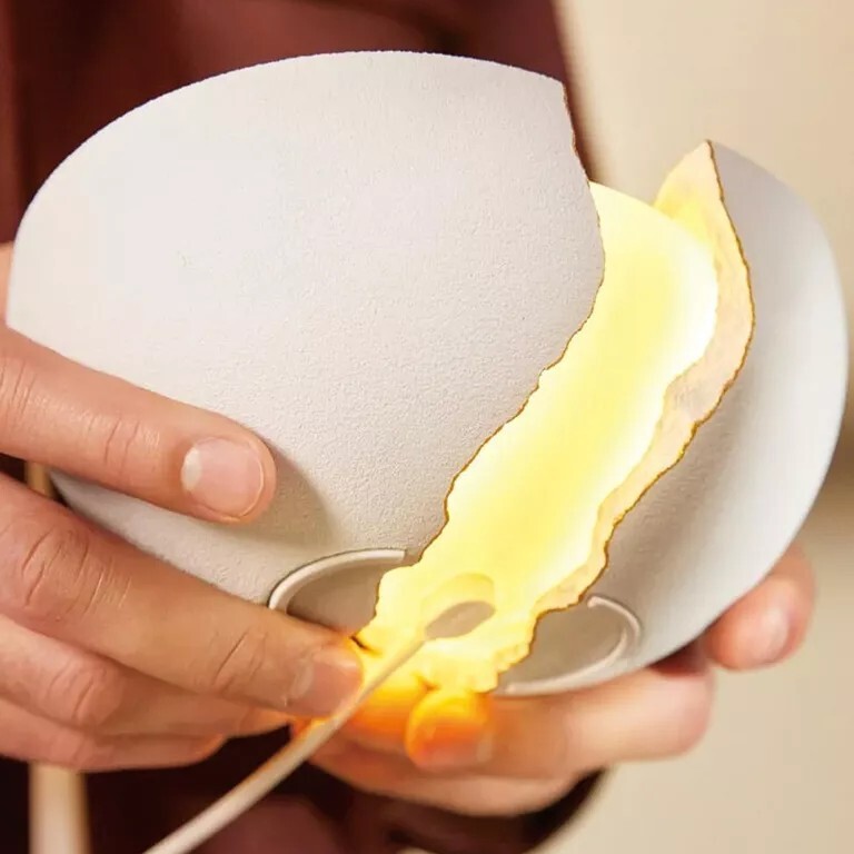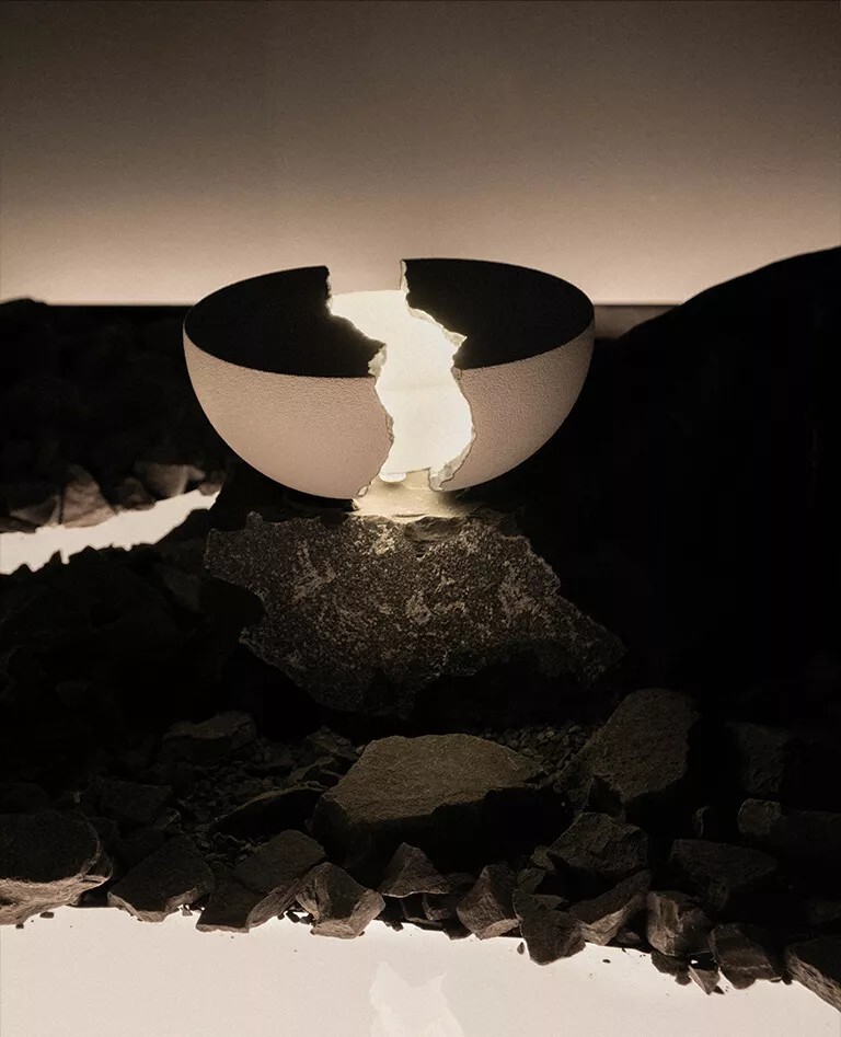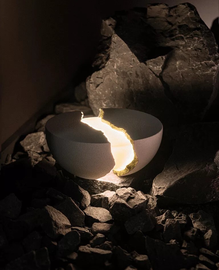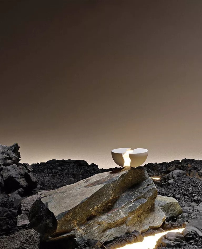 。如石頭般的外觀表面由沙子和樹脂的混合材料製成,賦予堅固而獨特的磨砂質感,從中撥開將從裂縫中透出暖白色的燈光