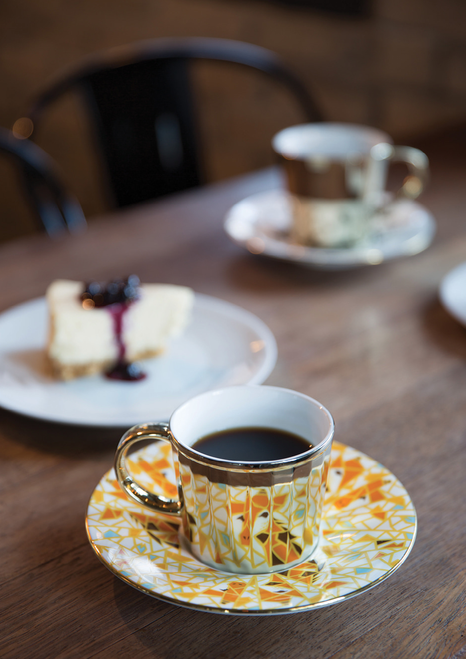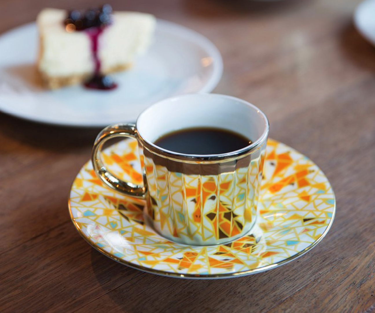 將杯子放在茶托上,杯子上的24面鏡子就會反射出來,茶托上隱藏在圖案中的圖像便會反覆出現。