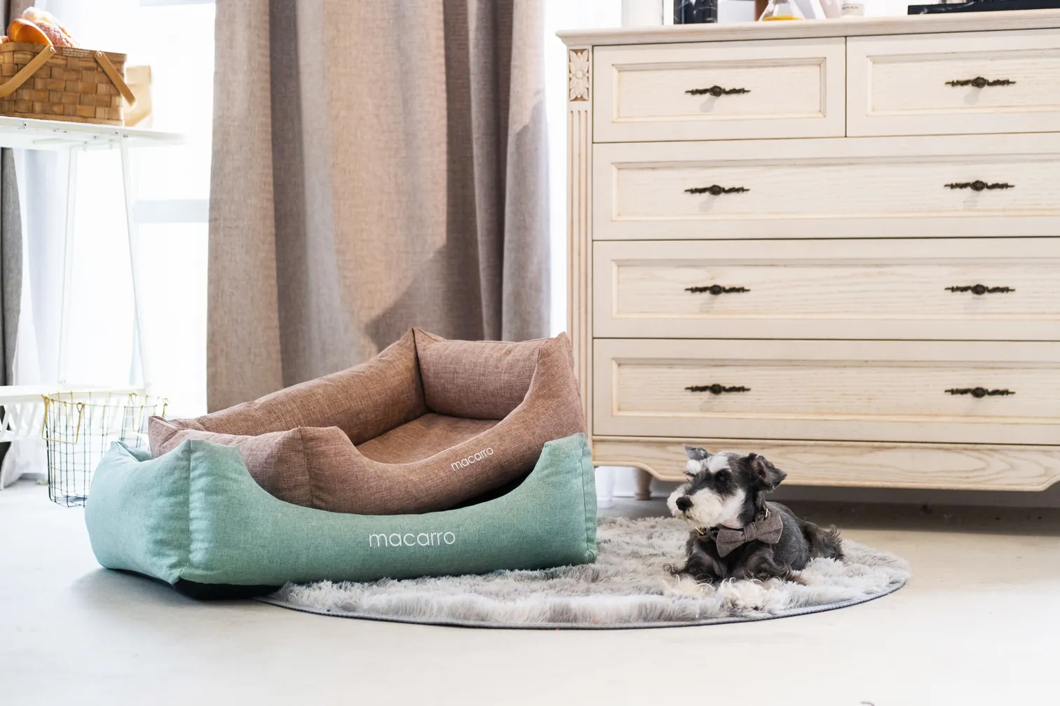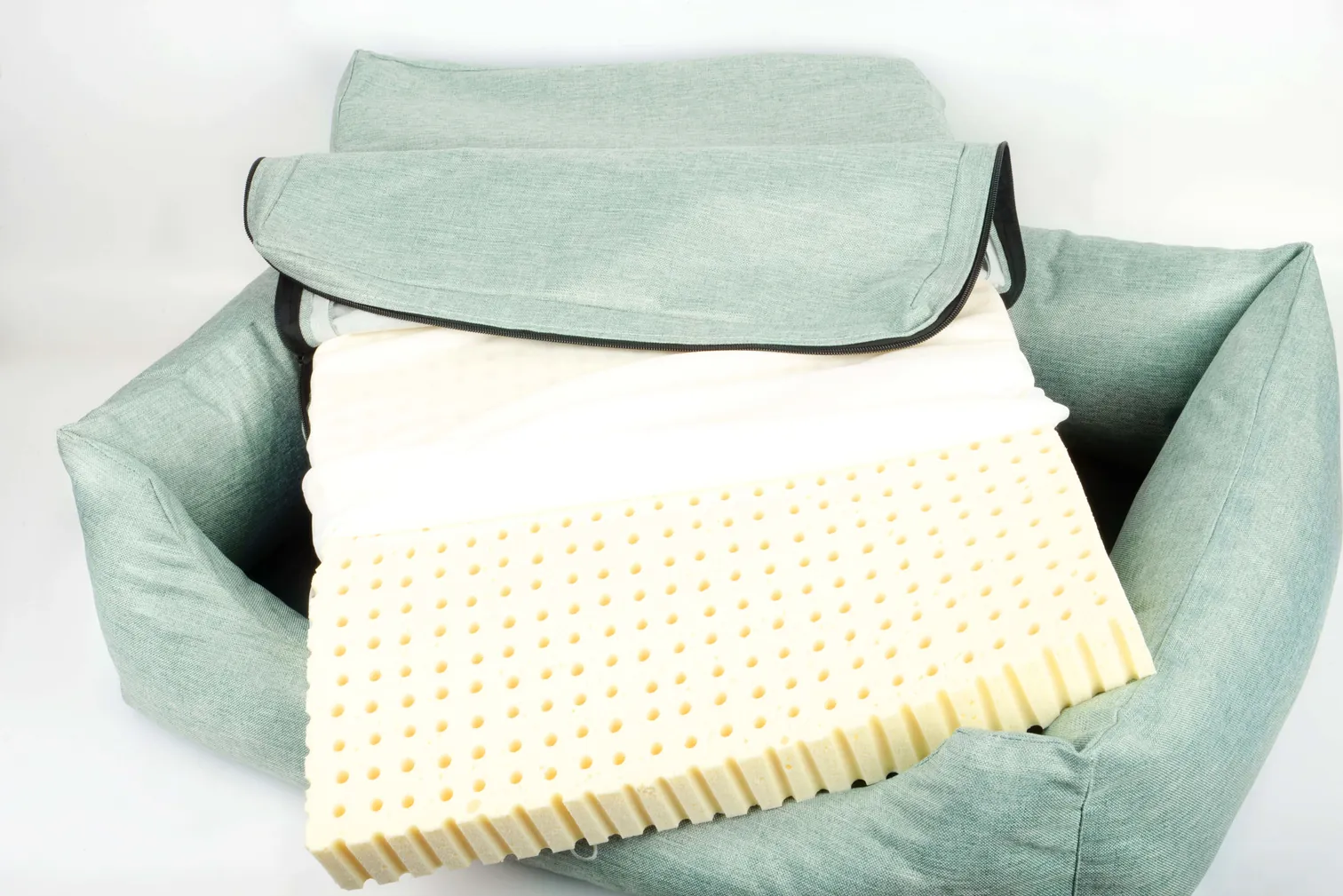 四邊使用優選棉花和聚酯纖維飽滿填充使毛孩頸椎得到足夠支撐中間搭配全天然乳膠床墊 給毛孩最純淨、舒適、無毒的健康天然床材全套可拆洗!毛爸媽不怕髒!