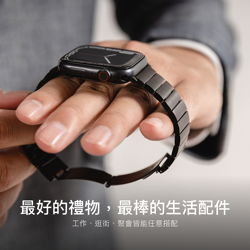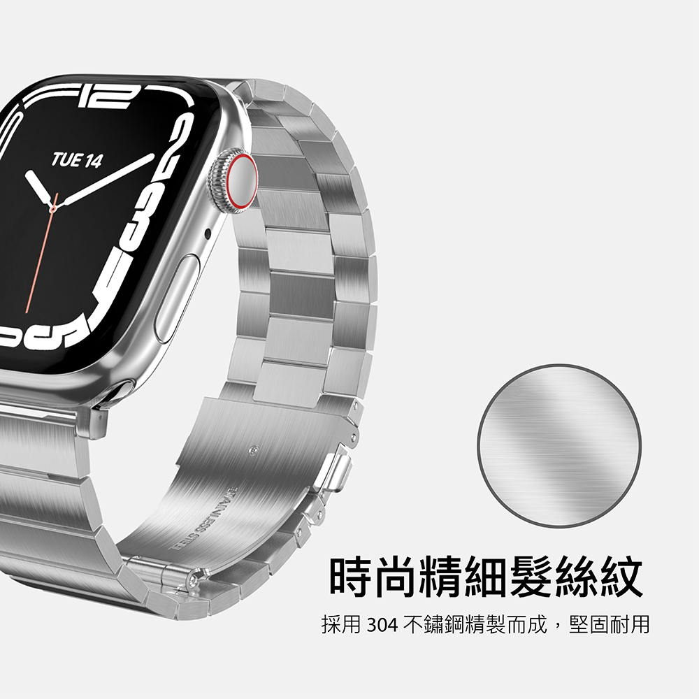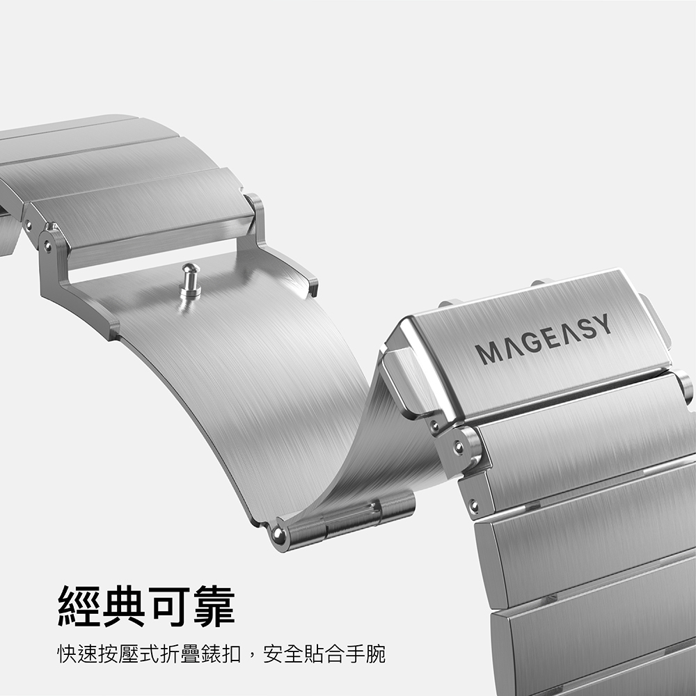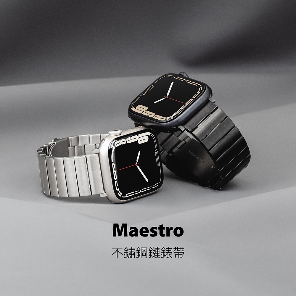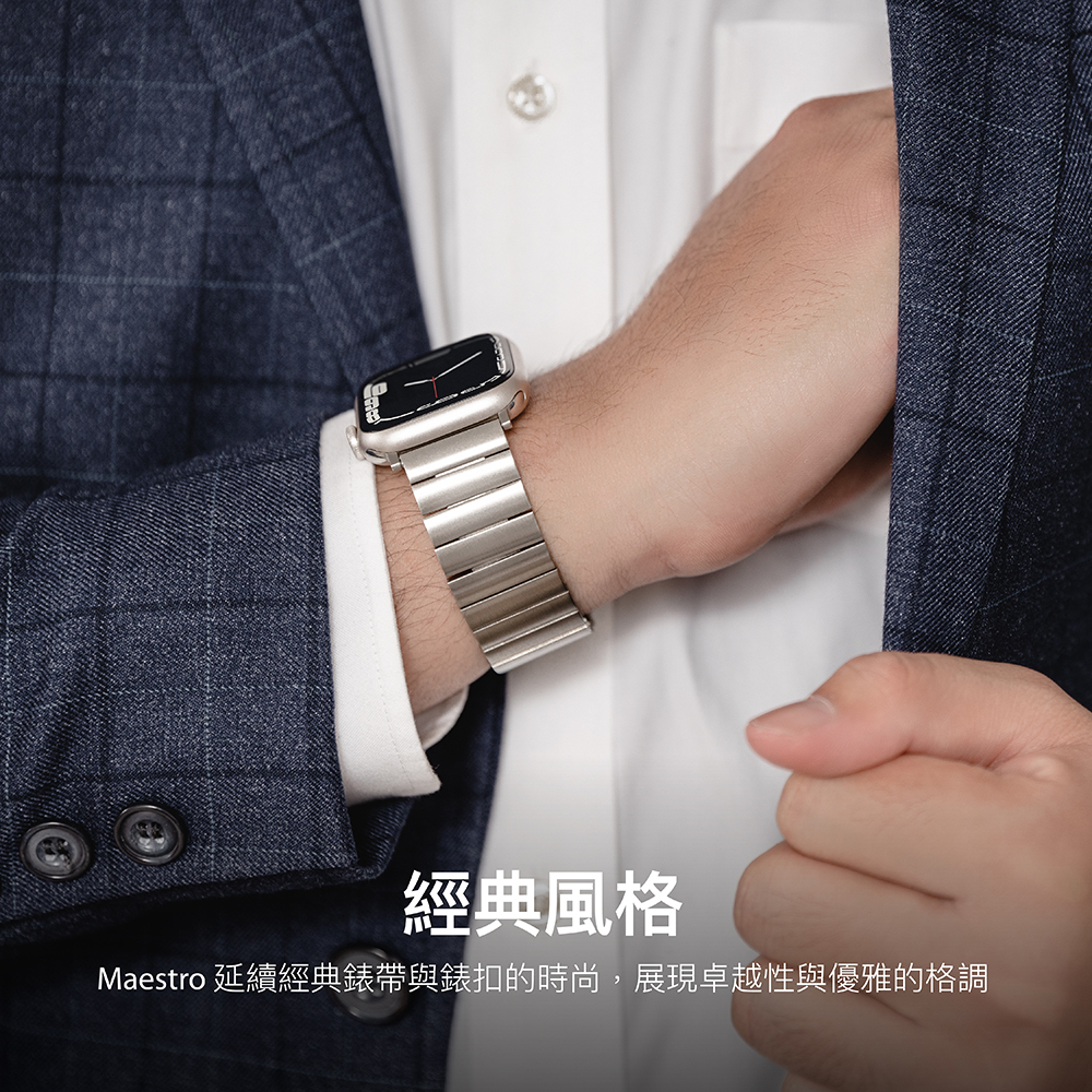 MAESTRO 採用304不鏽鋼精製而成,堅固且耐用。錶面拋光呈現髮絲紋,具有現代風格,並透過鏈接的方式設計,延續都會優雅的風範,更創造鏈式錶帶的創新。按壓式折疊錶扣是承襲傳統錶帶的設計概念,安全可靠,服貼舒適。隨附調整器,可以很簡單的依自己需要的尺寸做調整,方便實用。