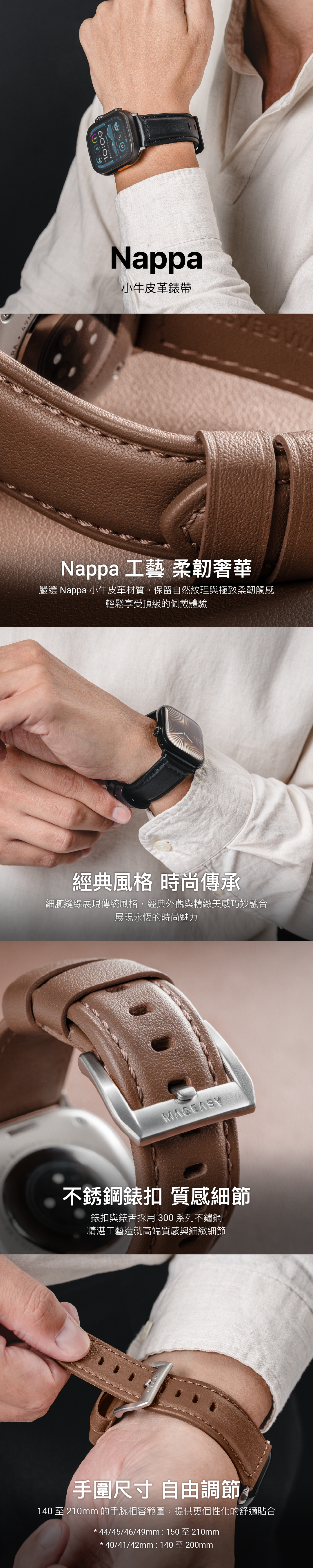 嚴選 Nappa 小牛皮革材質,保留自然紋理與極致柔韌觸感,輕鬆享受頂級的佩戴體驗