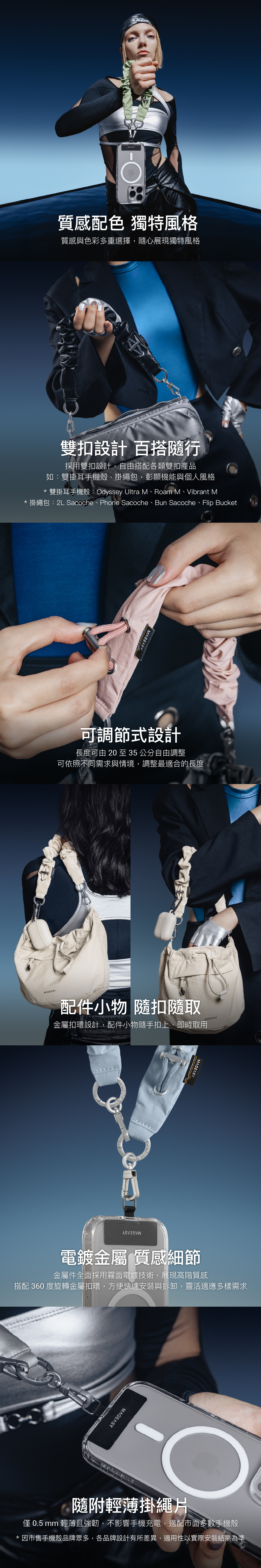 採用雙扣設計,自由搭配各類雙扣產品,如:雙掛耳手機殼*、掛繩包*,彰顯機能與個人風格