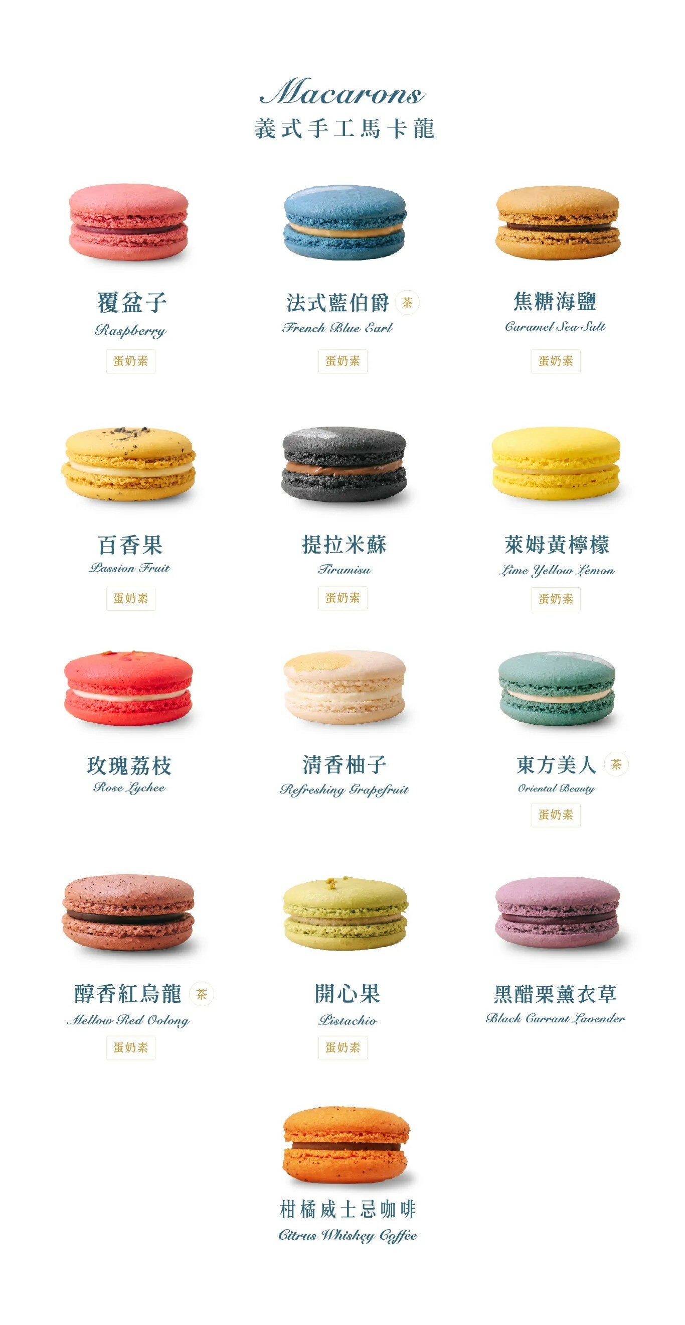 - 蛋奶素:經典覆盆子、萊姆黃檸、開心果、 東方美人、藍伯爵、焦糖海鹽、醇香紅烏龍、提拉米蘇、百香果、草莓奶霜