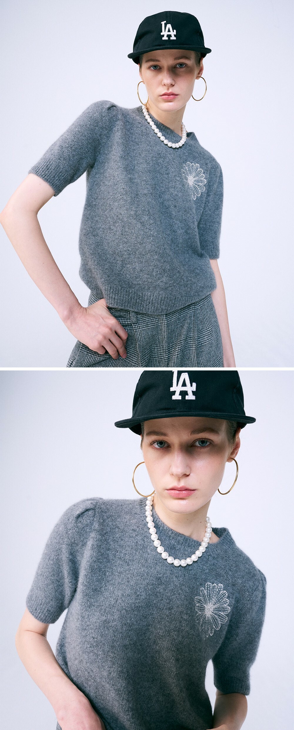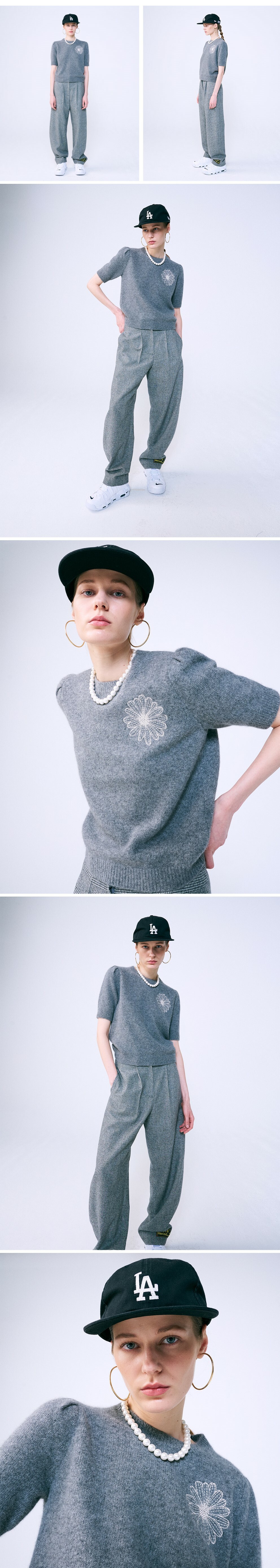 MARDI MERCREDI-短袖針織上衣-灰底/象牙白花
