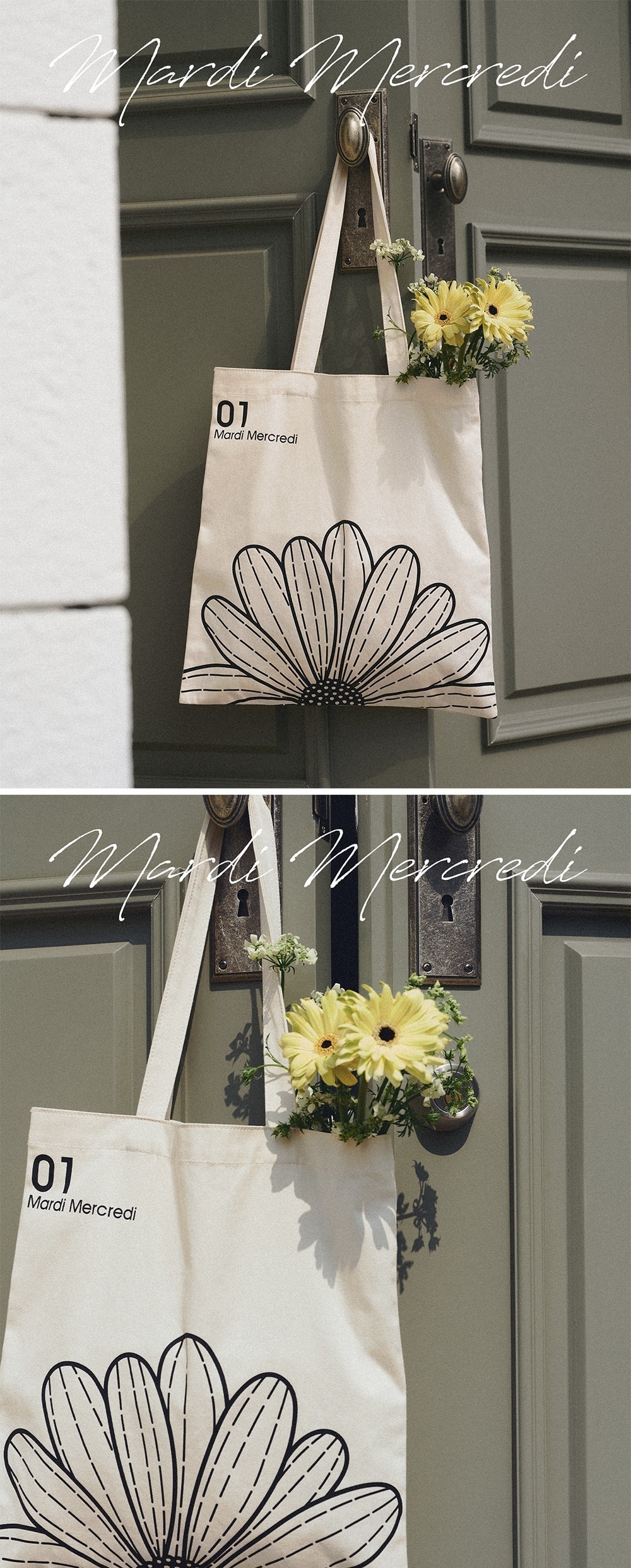 MARDI MERCREDI-小雛菊帆布袋 托特包 單肩包-奶油底/黑花