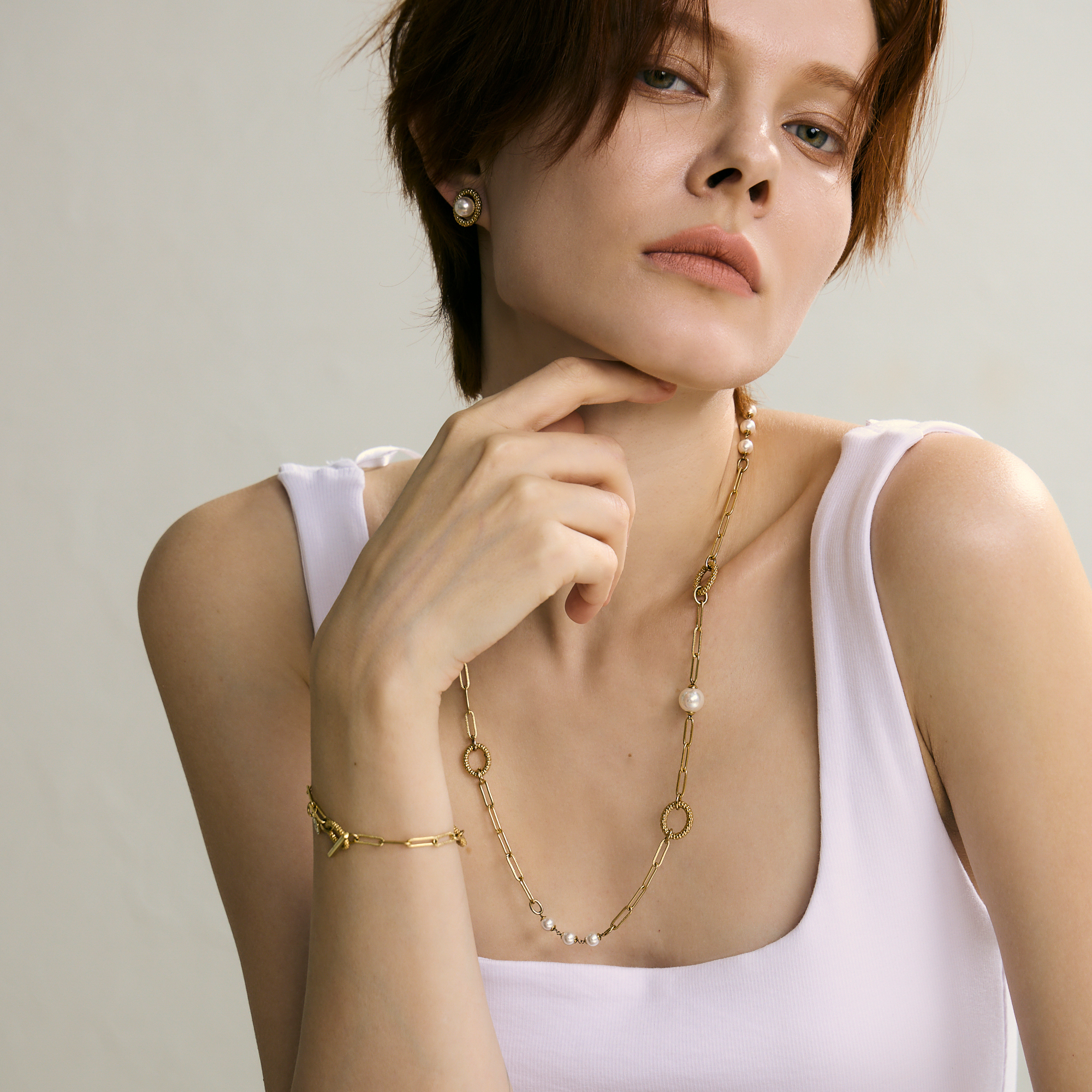 搭配永續E珍珠,於細緻鏈條上精巧排列,是一件具有獨特節奏與韻律感的項鍊,可以選擇喜歡的角度旋轉配戴,展現不對稱的獨特風格,也可與同系列鏈條項鍊搭配,呈現豐富視覺效果。