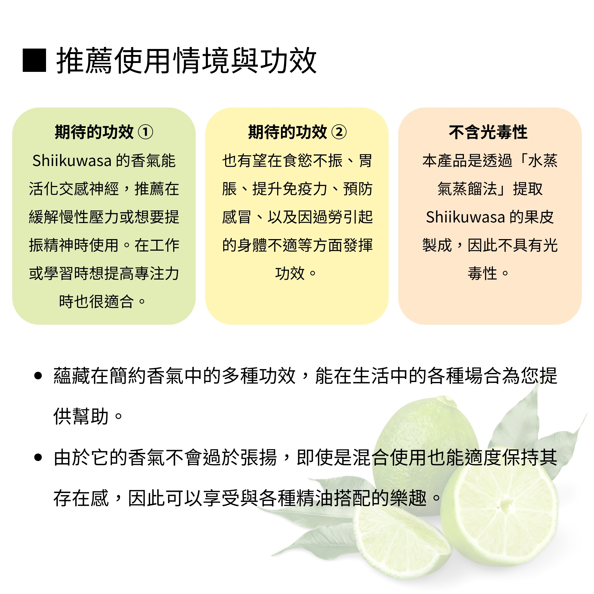 ・沖繩香檬精油:香氣能啟動交感神經,適合長期壓力或提神使用
