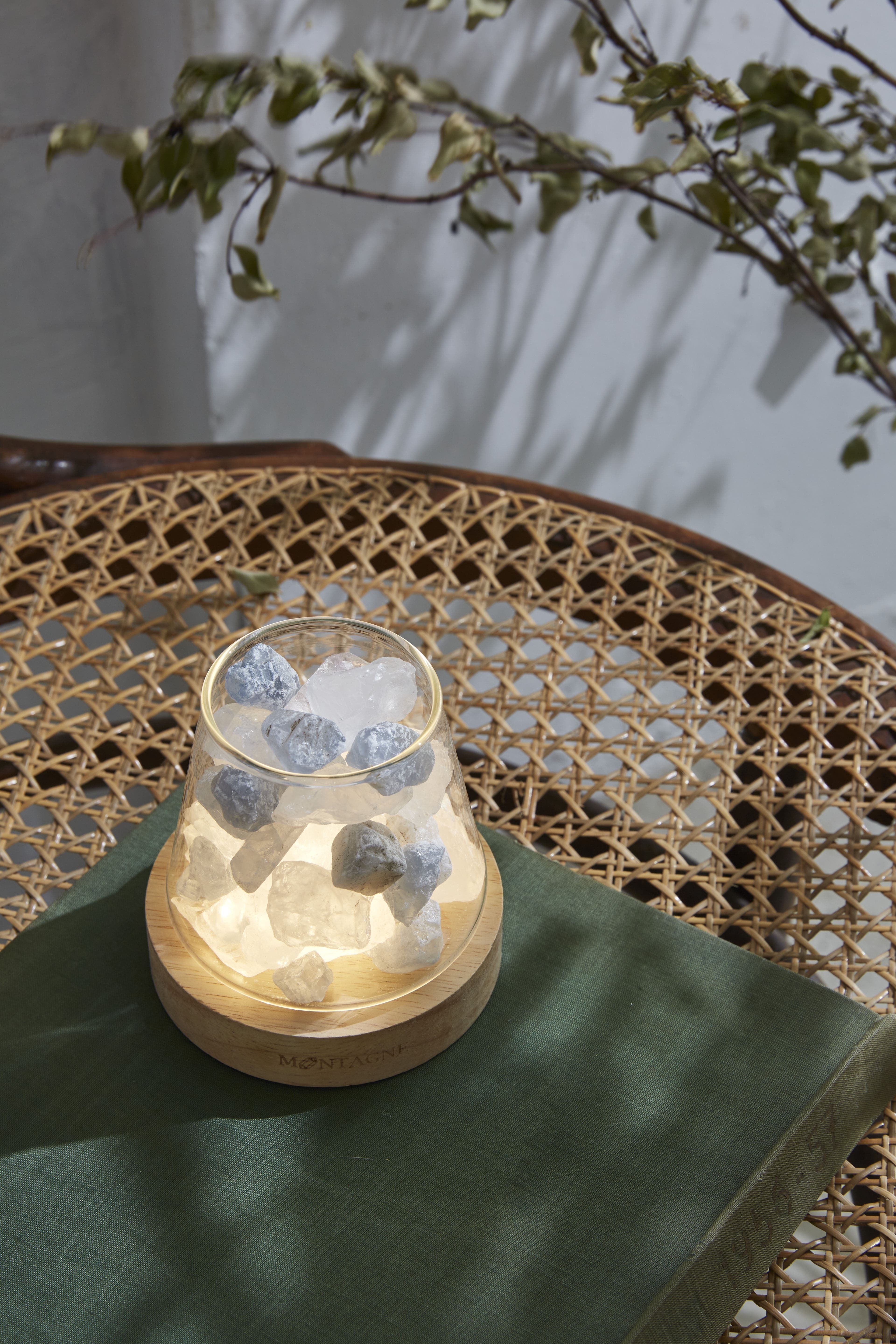 商品如山形杯般盛載水晶,透過燈光底座照射,展現天然水晶的瑰麗光澤。源自巴西的純天然水晶,未經拋光、修飾,展現最純粹、原始之美。