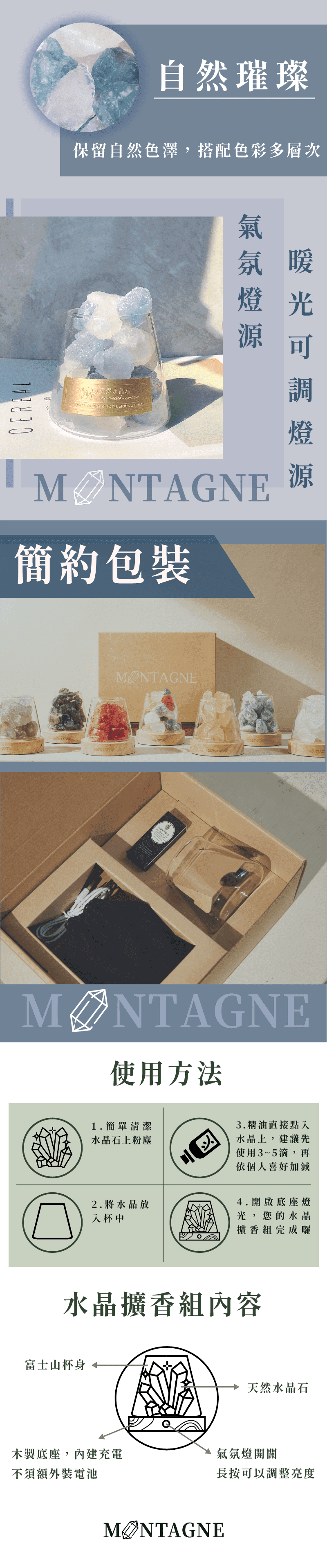 MONTAGNE 法文意為「山」,我們深信唯有在雄偉山脈中,孕育著永恆水晶,才能賦予最真實的能量。
