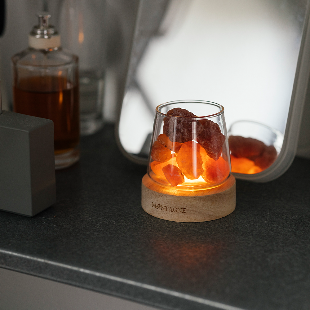 商品如山形杯般盛載水晶,透過燈光底座照射,展現天然水晶的瑰麗光澤。源自巴西的純天然水晶,未經拋光、修飾,展現最純粹、原始之美。