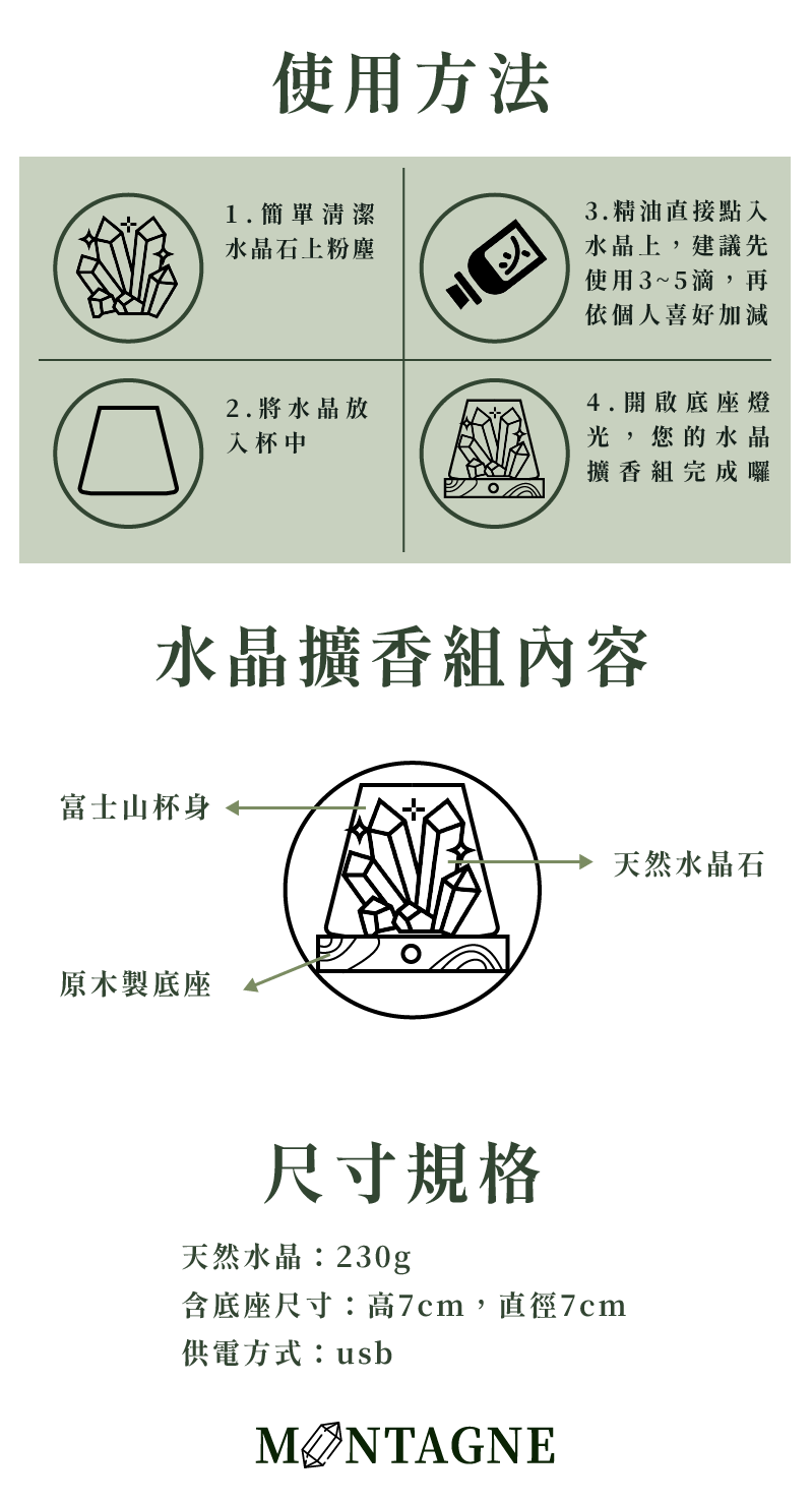 MONTAGNE 法文意為「山」,我們深信唯有在雄偉山脈中,孕育著永恆水晶,才能賦予最真實的能量。
