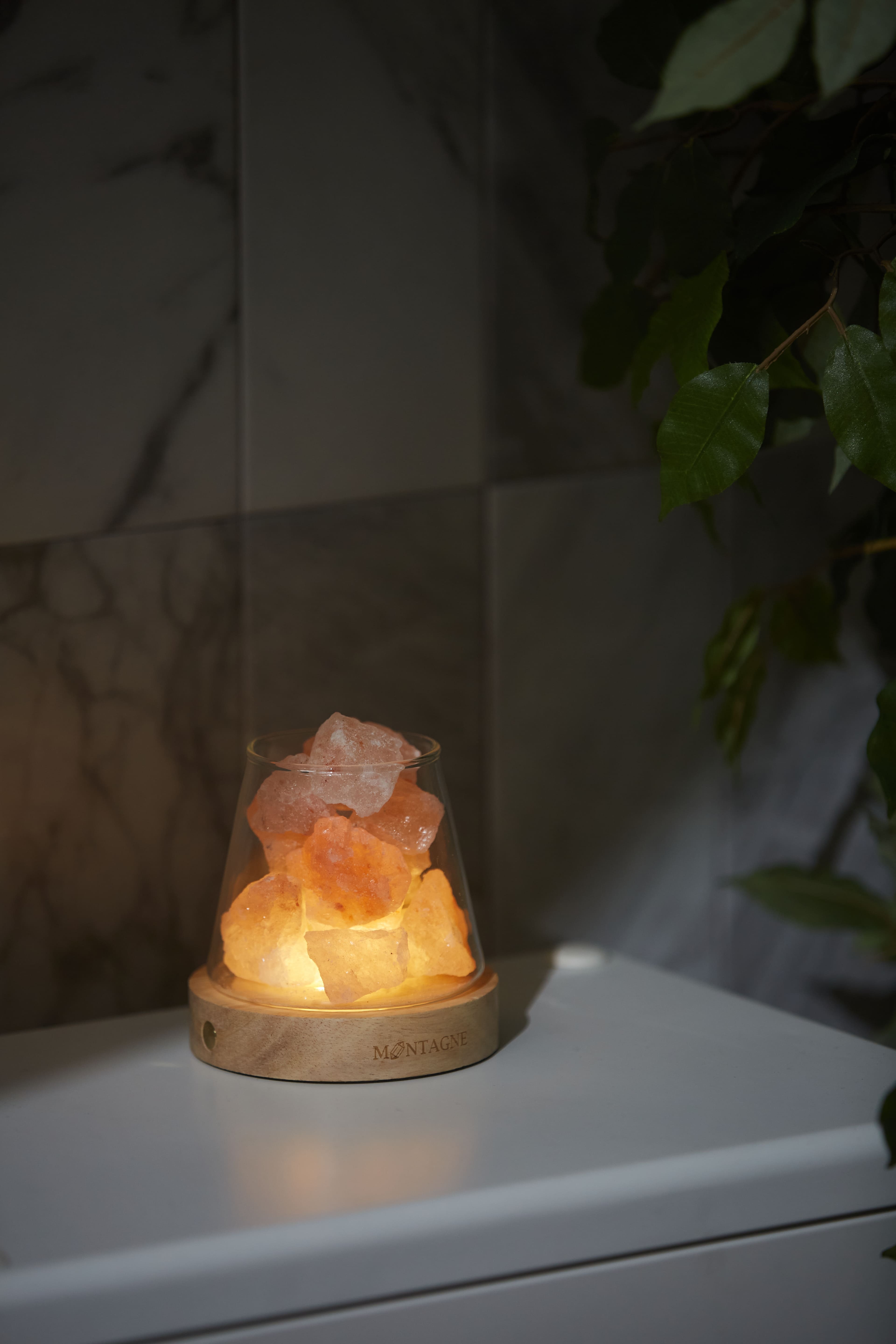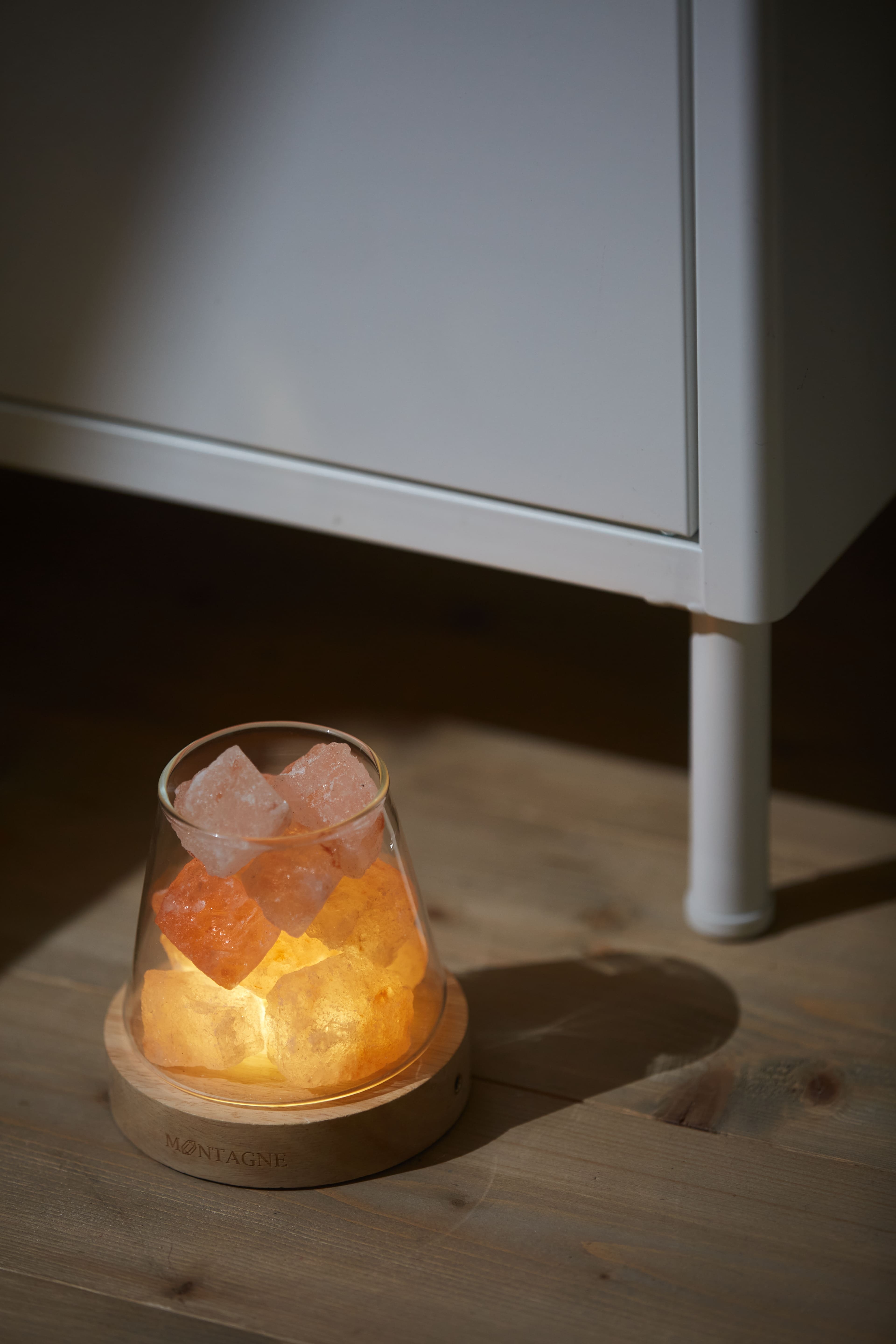 商品如山形杯般盛載水晶,透過燈光底座照射,展現天然水晶的瑰麗光澤。源自巴西的純天然水晶,未經拋光、修飾,展現最純粹、原始之美。