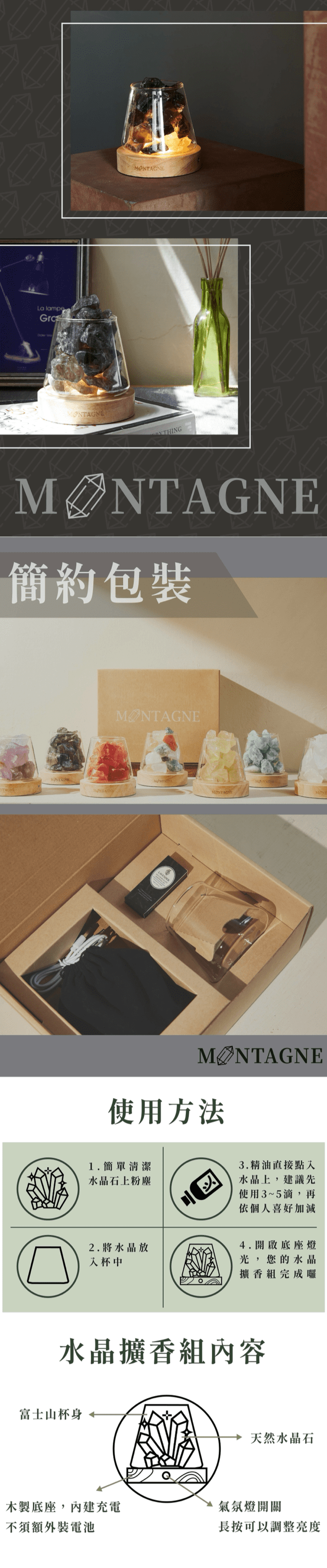 MONTAGNE 法文意為「山」,我們深信唯有在雄偉山脈中,孕育著永恆水晶,才能賦予最真實的能量。