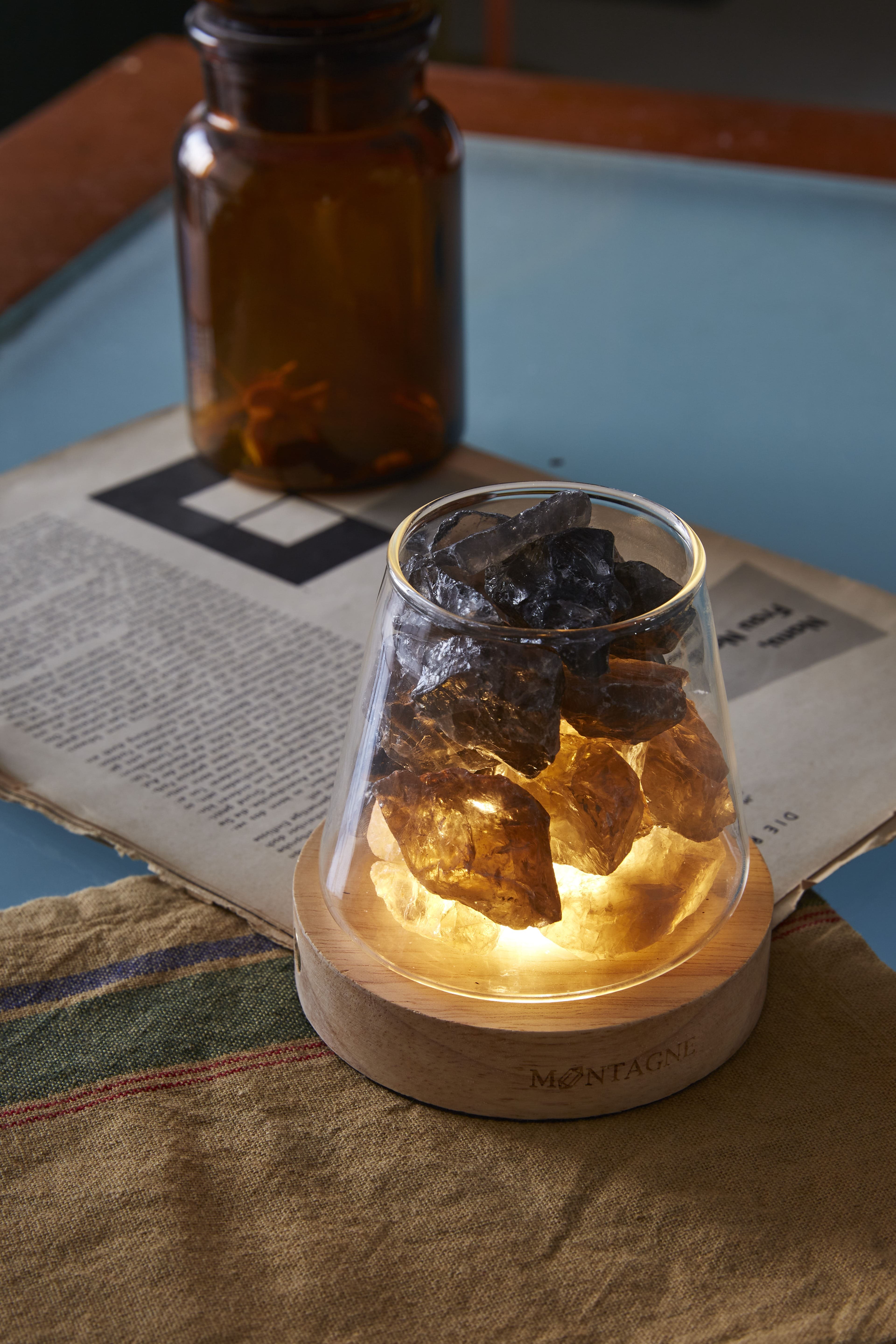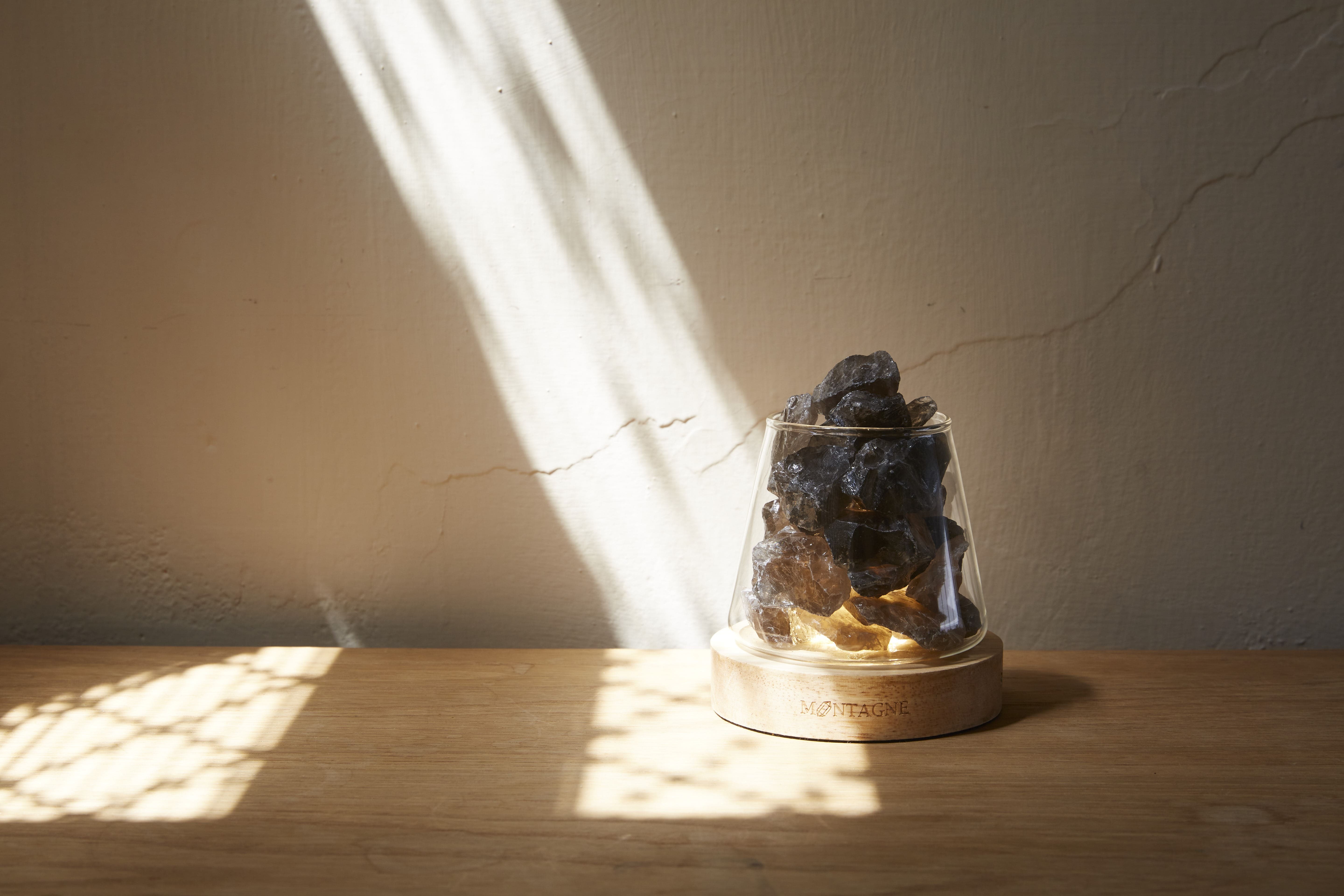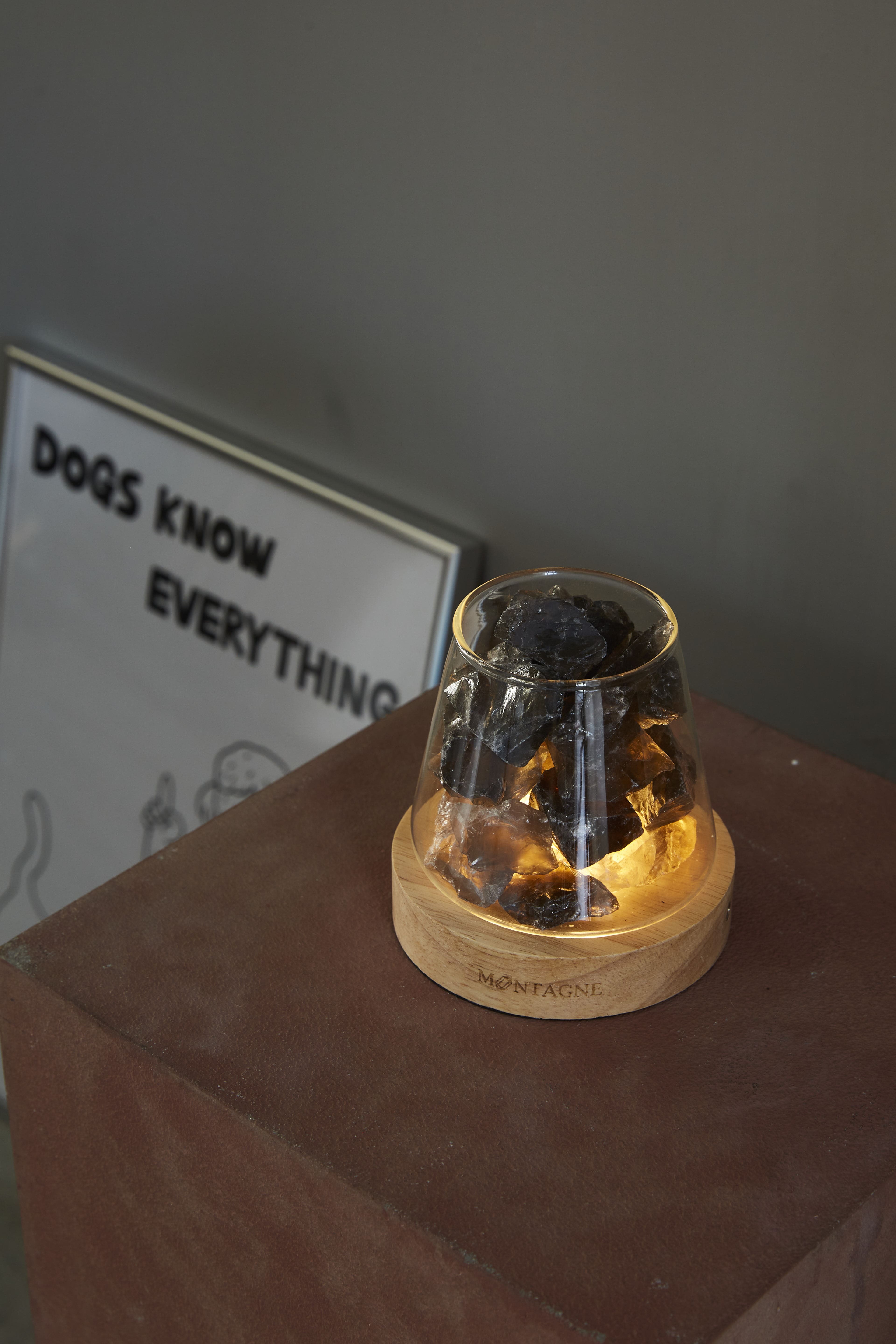 商品如山形杯般盛載水晶,透過燈光底座照射,展現天然水晶的瑰麗光澤。源自巴西的純天然水晶,未經拋光、修飾,展現最純粹、原始之美。