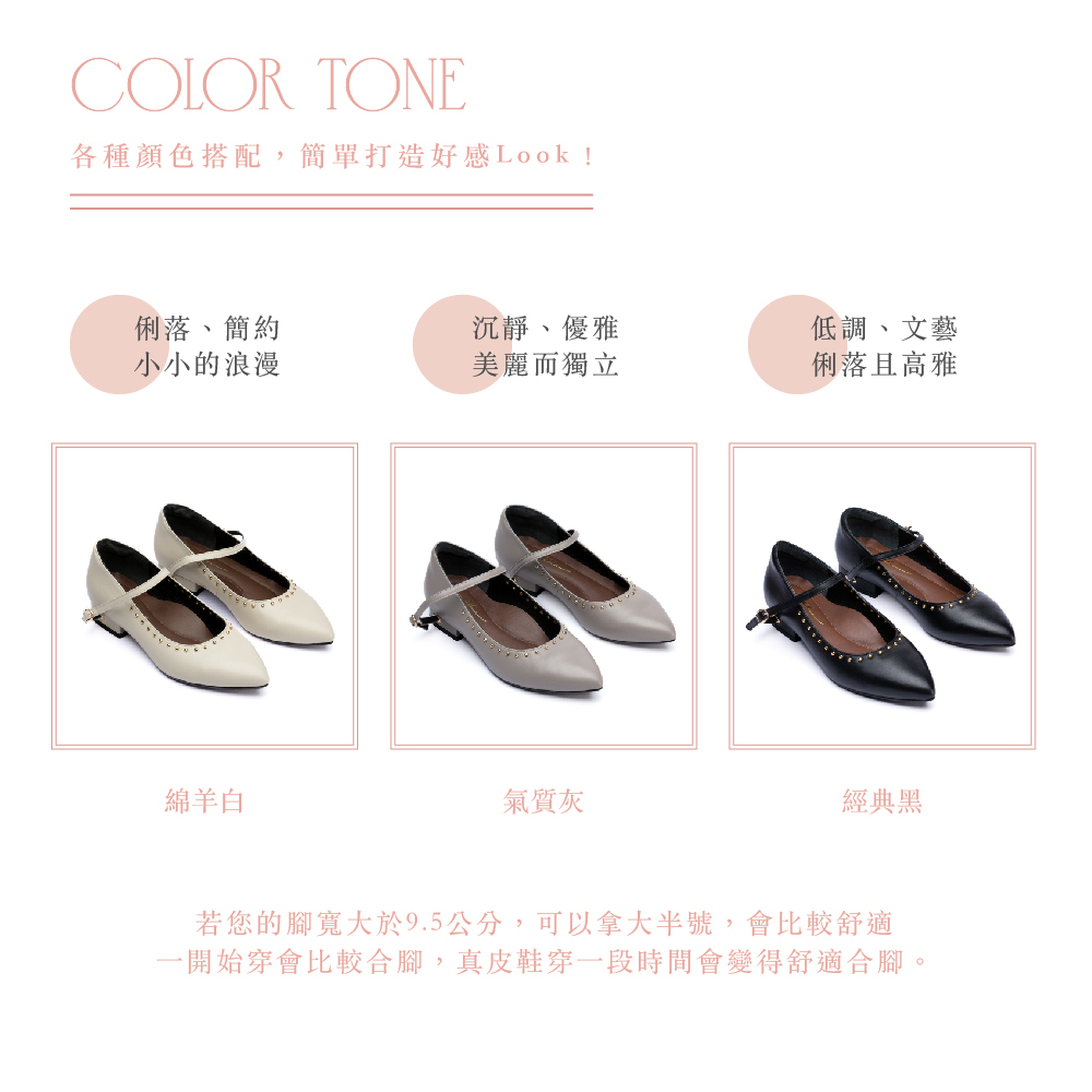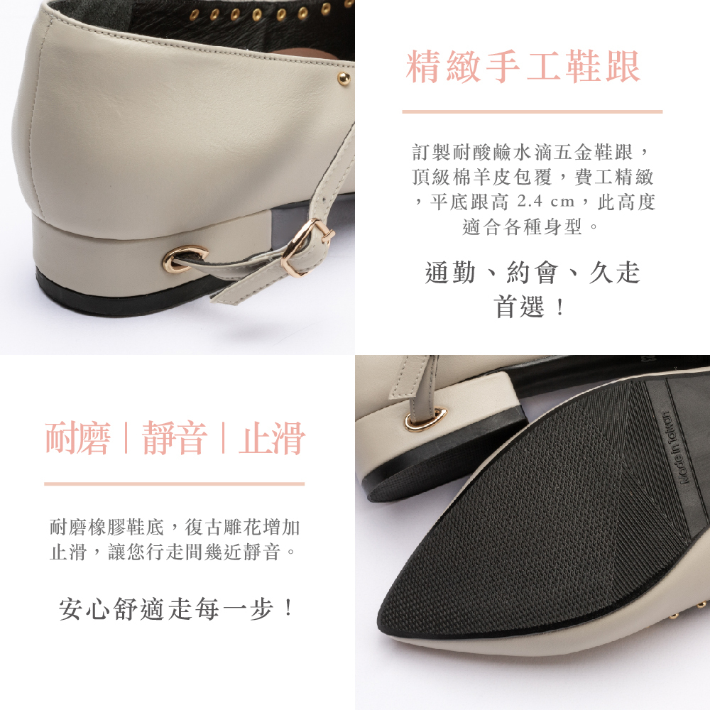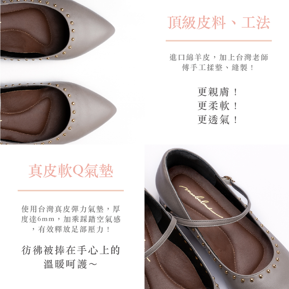 具有6mm真皮彈力氣墊,結合雲朵枕頭後跟和腳趾氣墊包覆。進口頂級特軟綿羊皮,由製鞋經驗30年的台灣老師傅手工揉整、縫製,手工打入鉚釘,特殊設計的鞋跟交錯繫帶,展現溫柔與力量並存的細節之美。