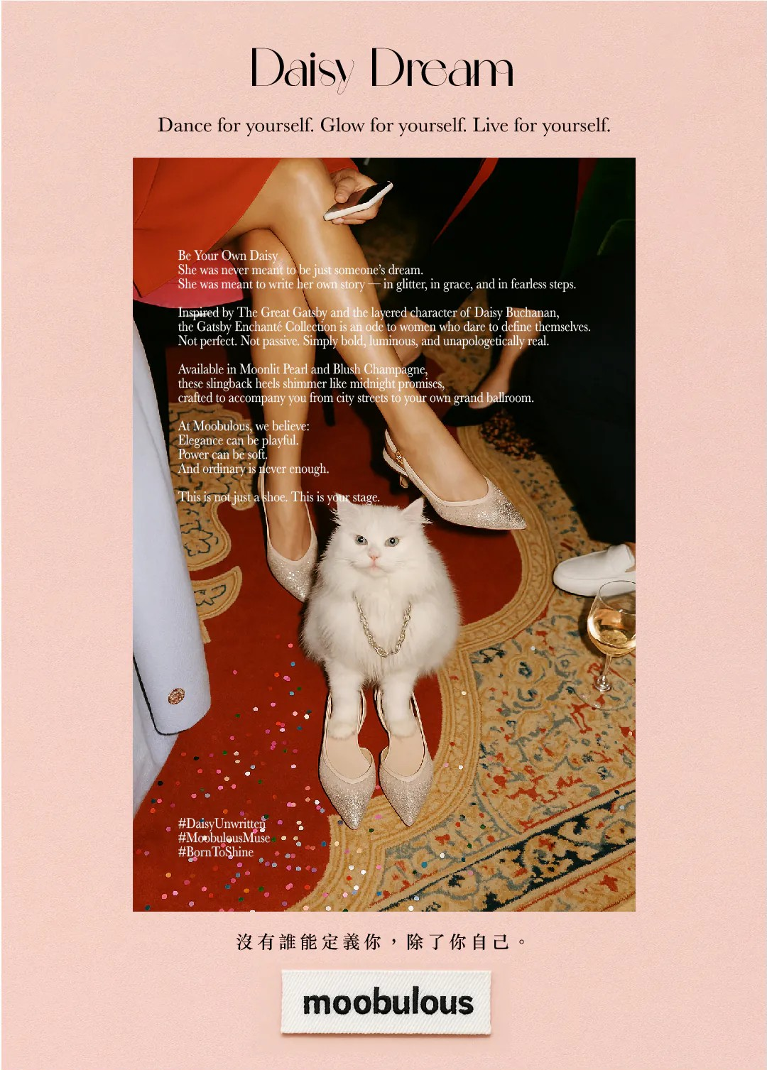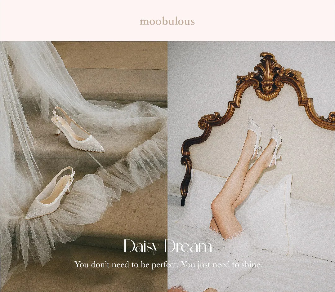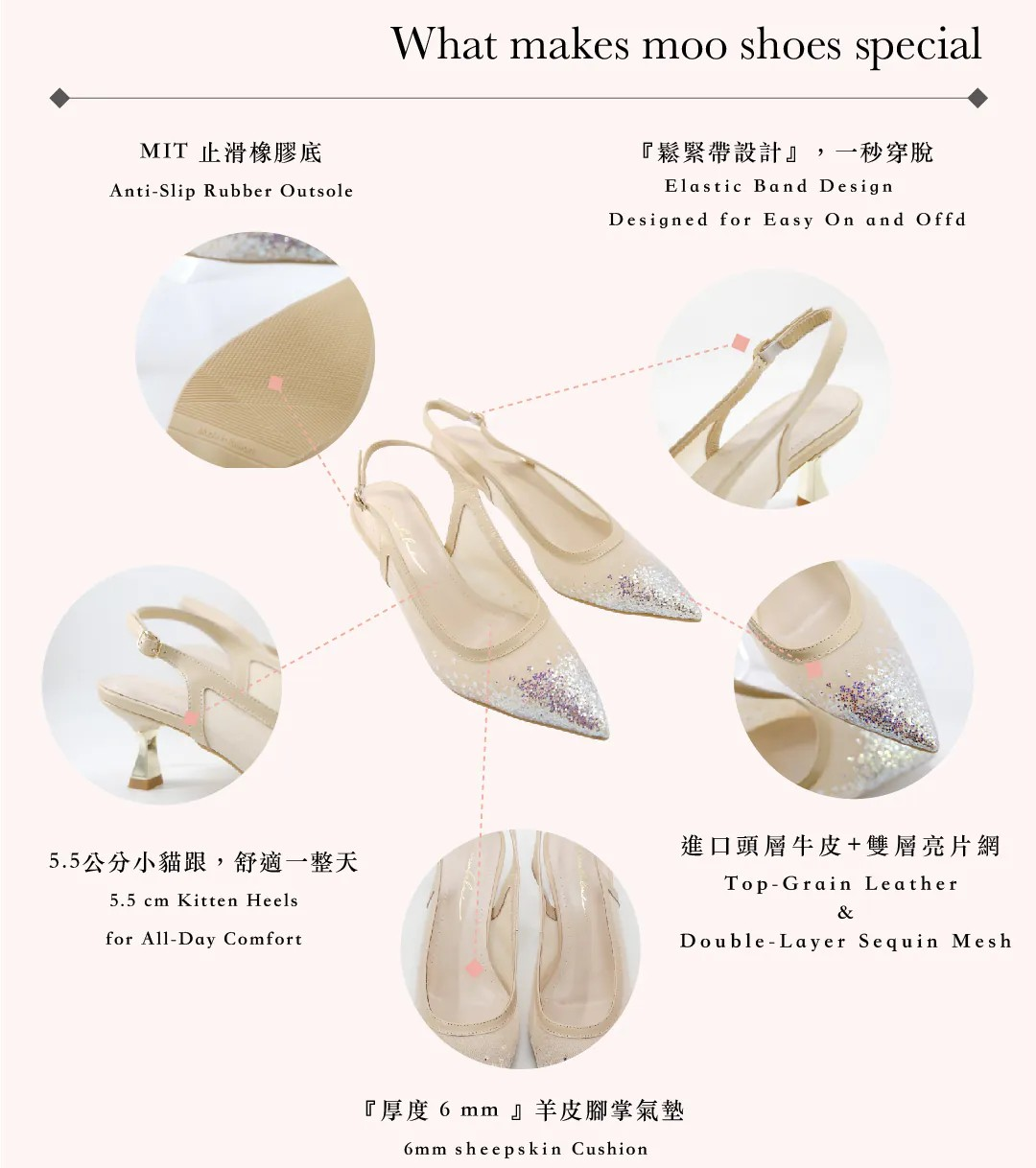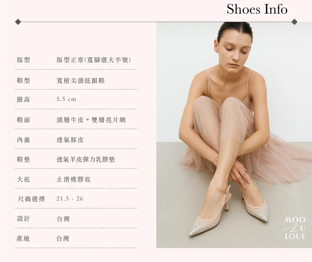 在璀璨浮華之中,做最閃耀的自己,閃耀銀白與香檳粉膚兩款,手工漸層亮片勾勒出流光溢彩的夢境,尖頭設計修飾線條,舒適小貓跟讓每一步都充滿自信與柔韌力量。Be playful, be elegant, be Moobulous.