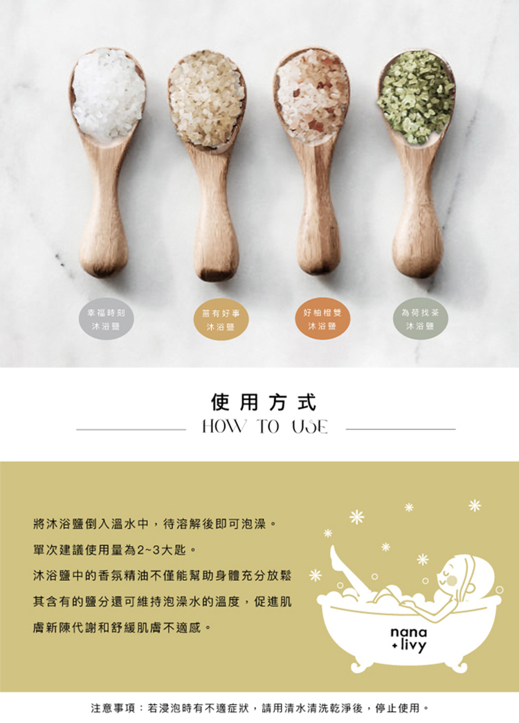沐浴鹽使用方法:適量的浴鹽溶解在熱水浴或溫水中後浸泡全身或足部以進