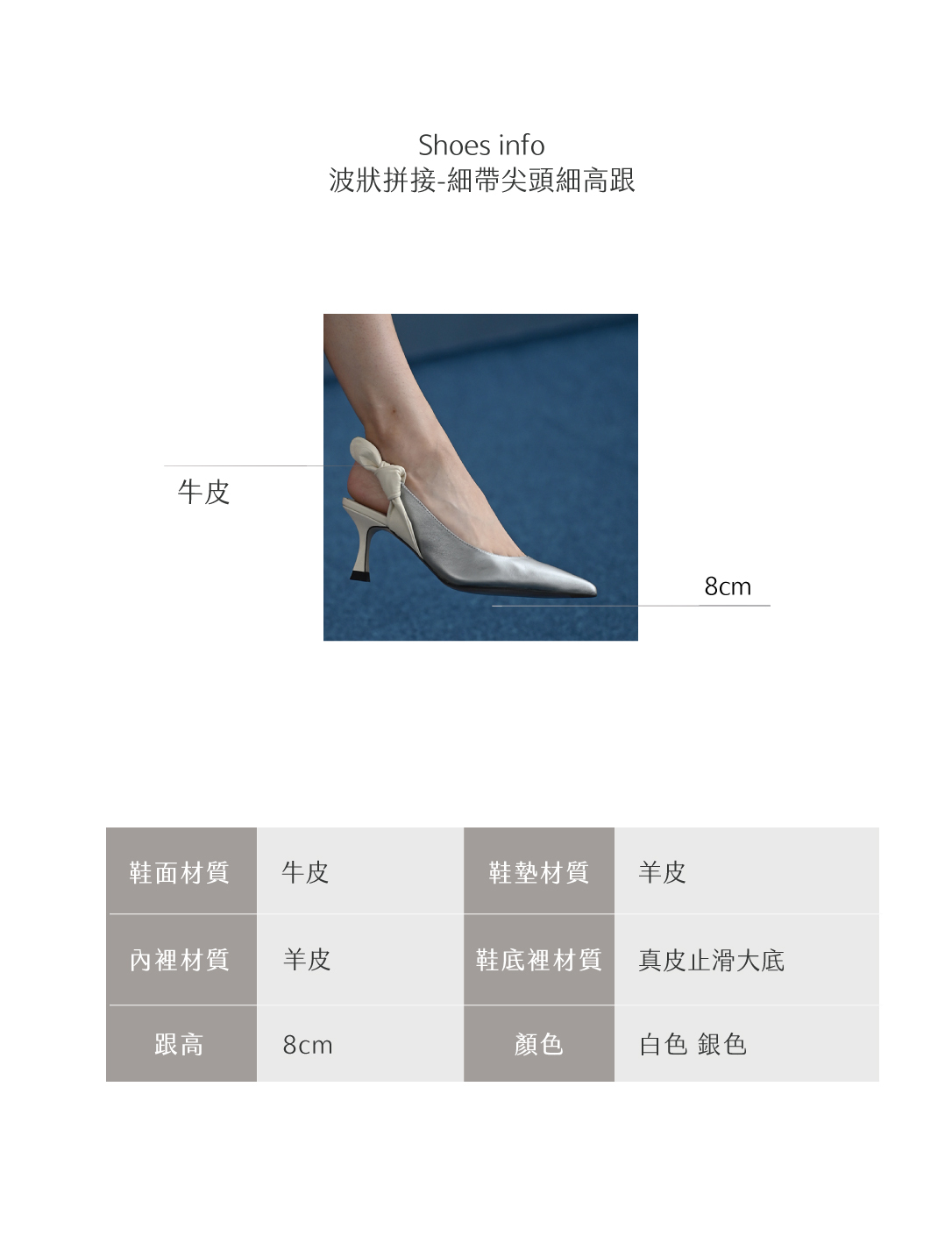 跟高:8公分鞋底材質 真皮大底( 鞋底前掌防滑生膠 )