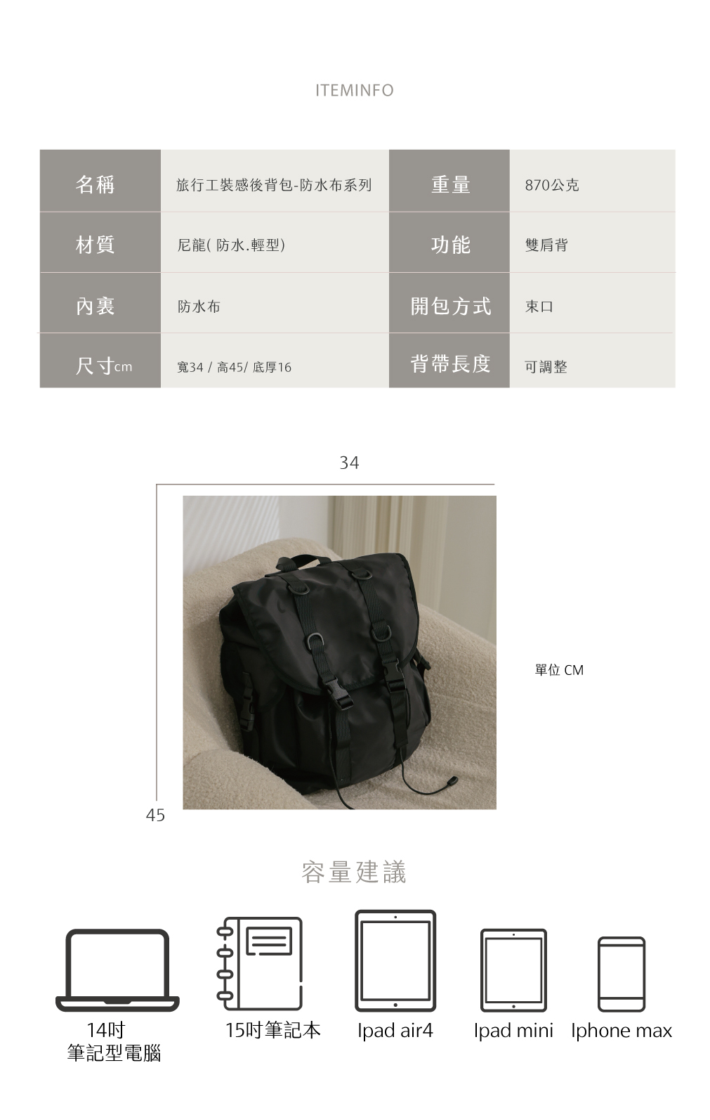 建議容量:書本/14吋筆電/摺疊傘
