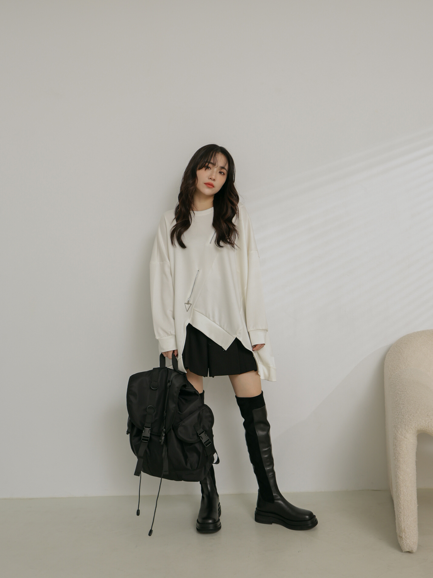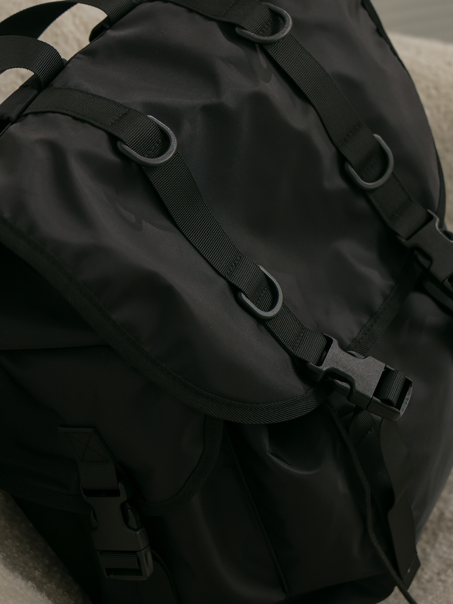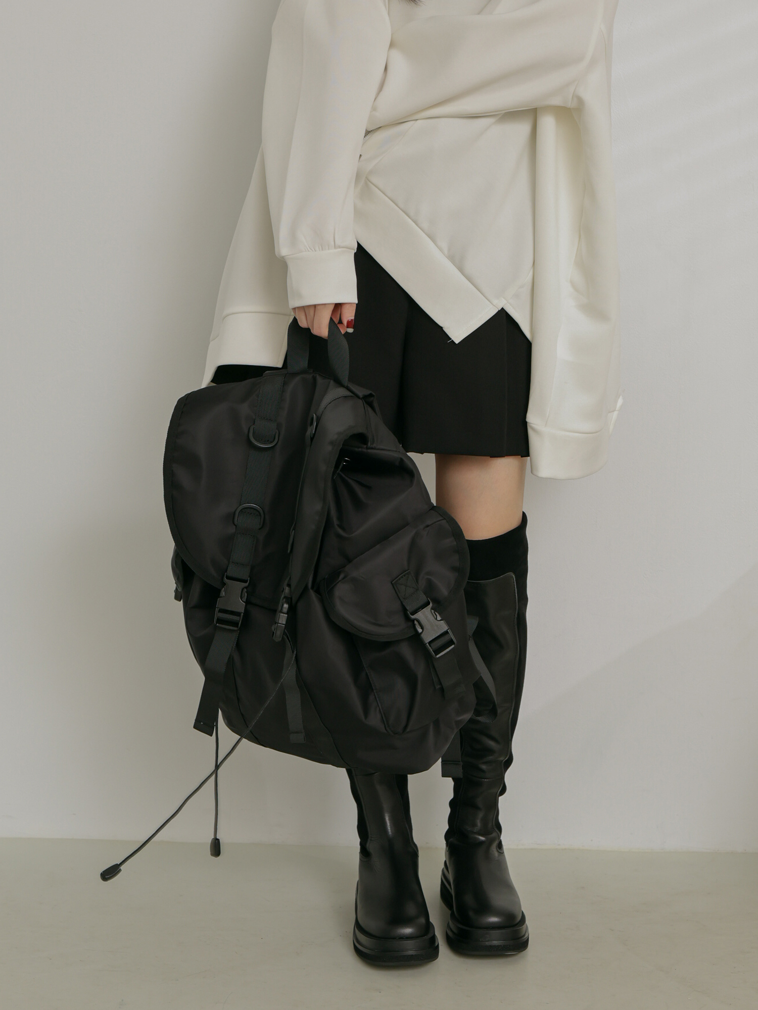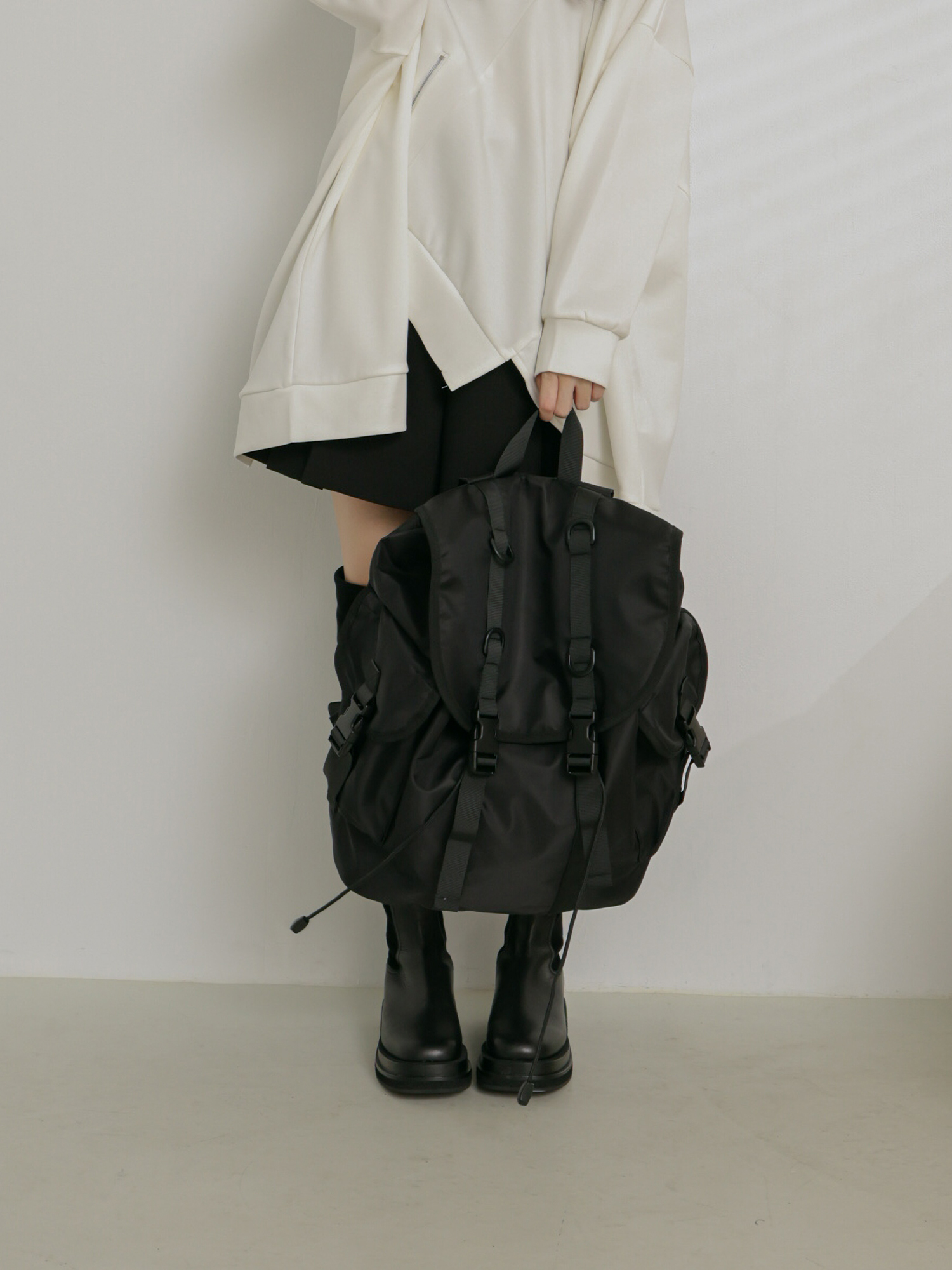 夾層:束繩封包口,內部一個拉鍊暗袋x1、側袋x2,