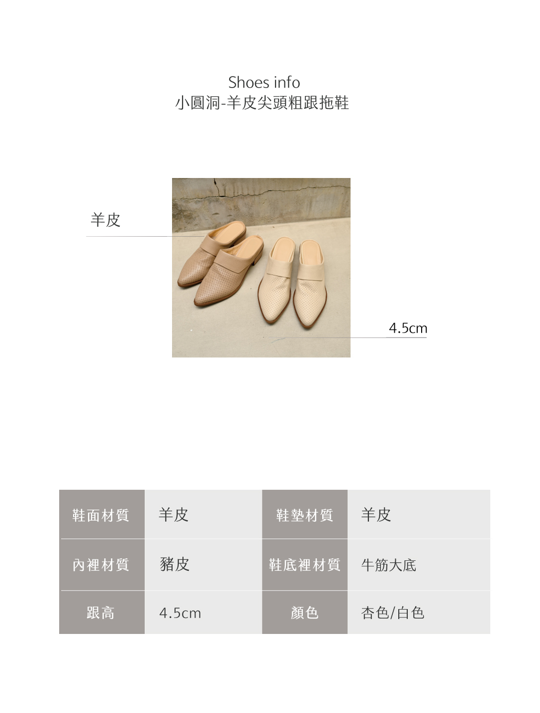 鞋面:羊皮 | 腳底墊皮:羊皮 |鞋裡:豬皮