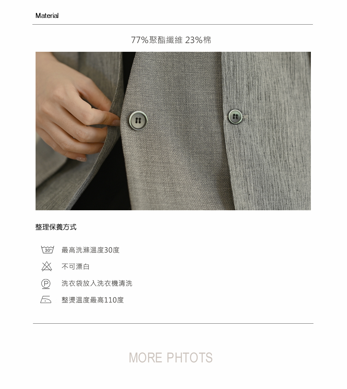 |尺寸和面料|下方有圖表說明 衣物保養方式