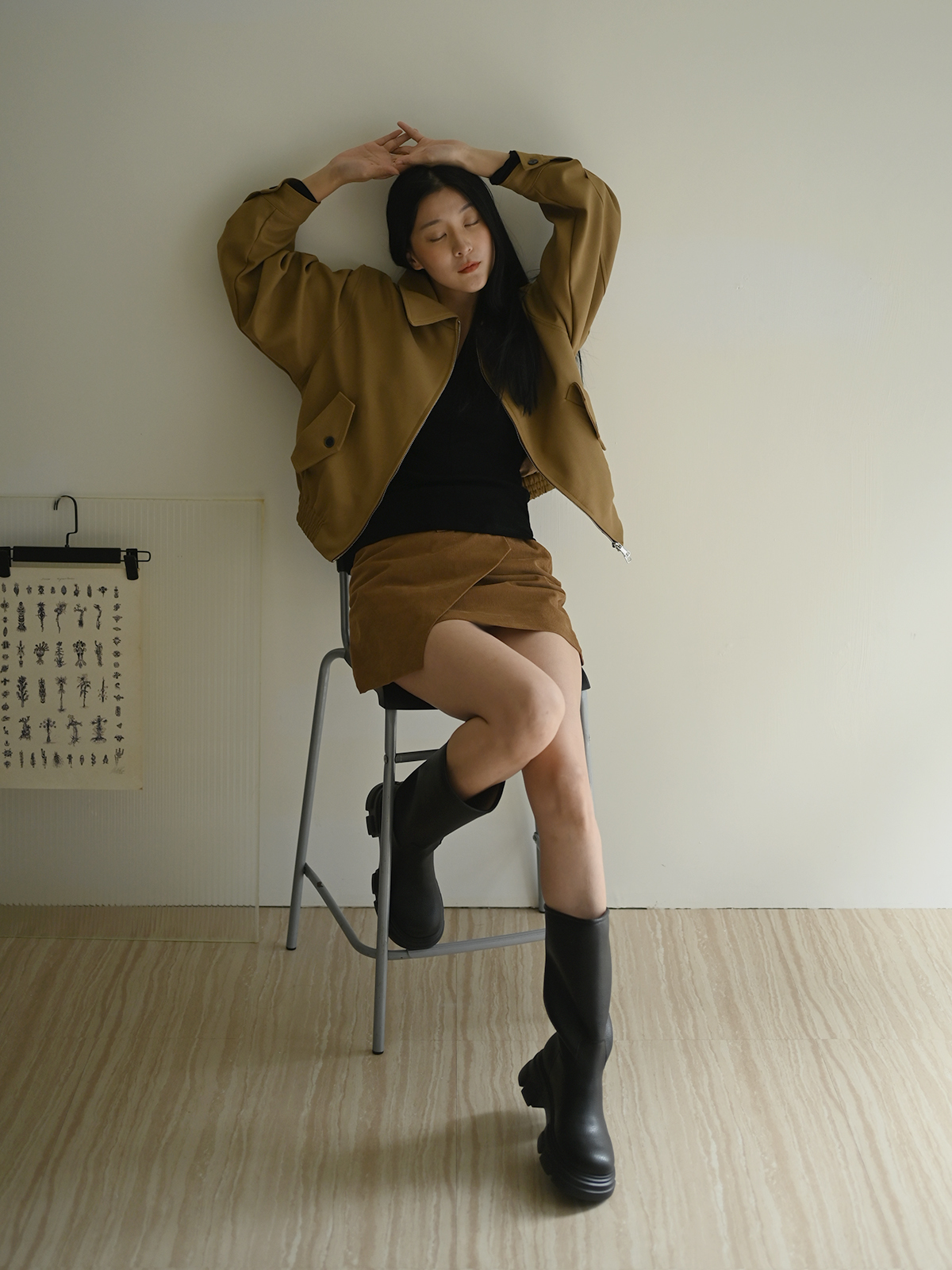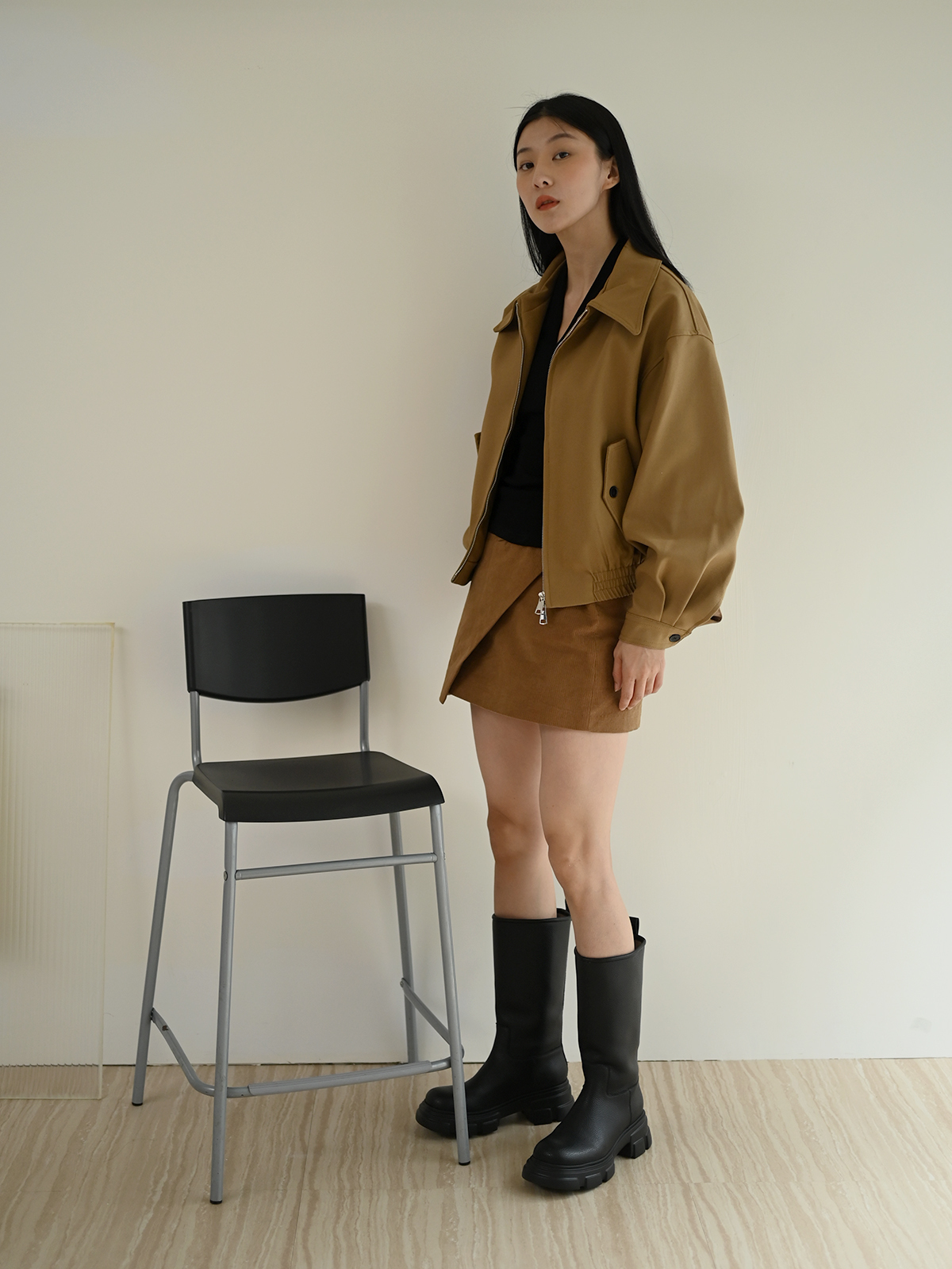 搭配簡約的上衣和絨布短裙