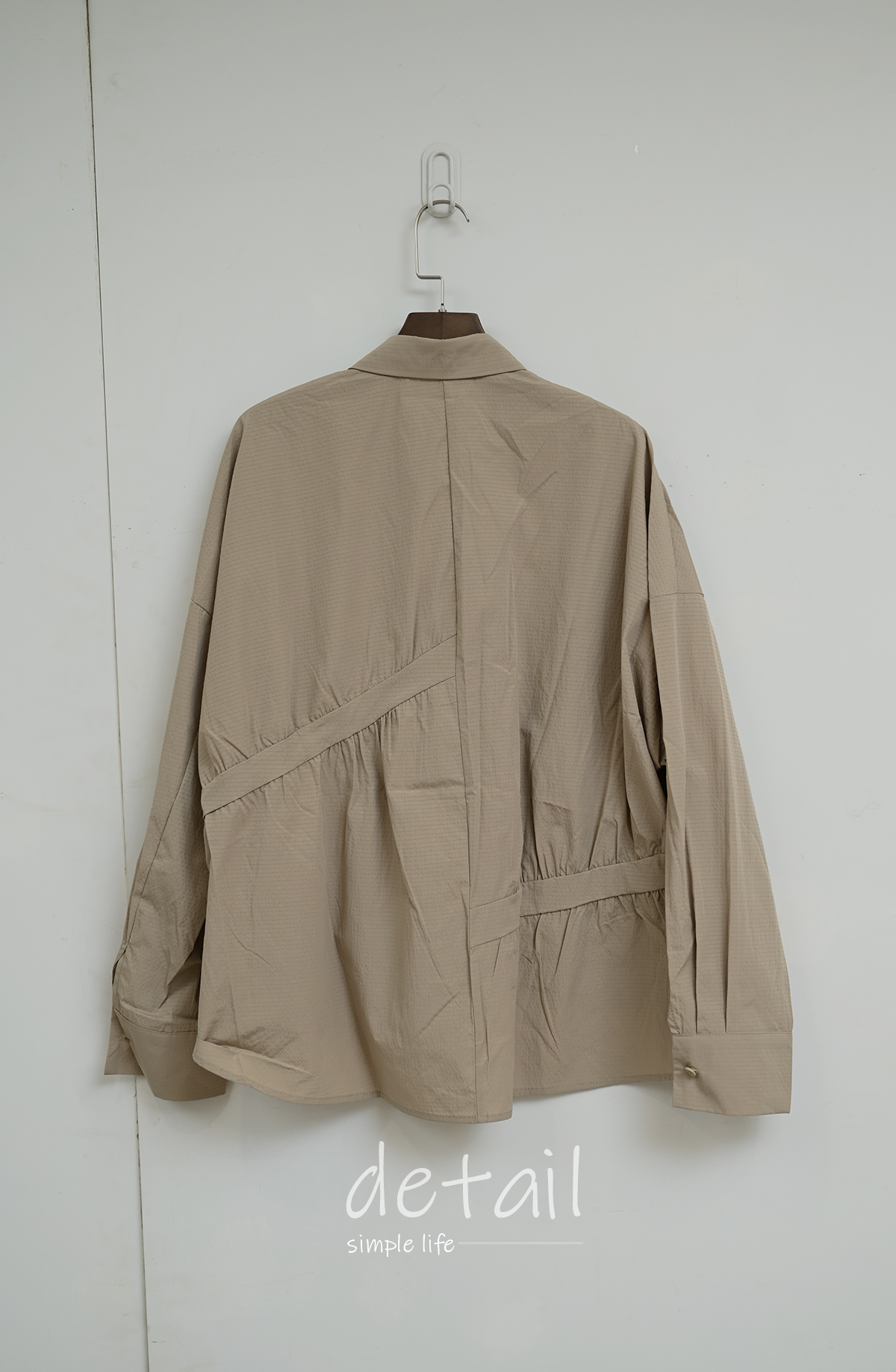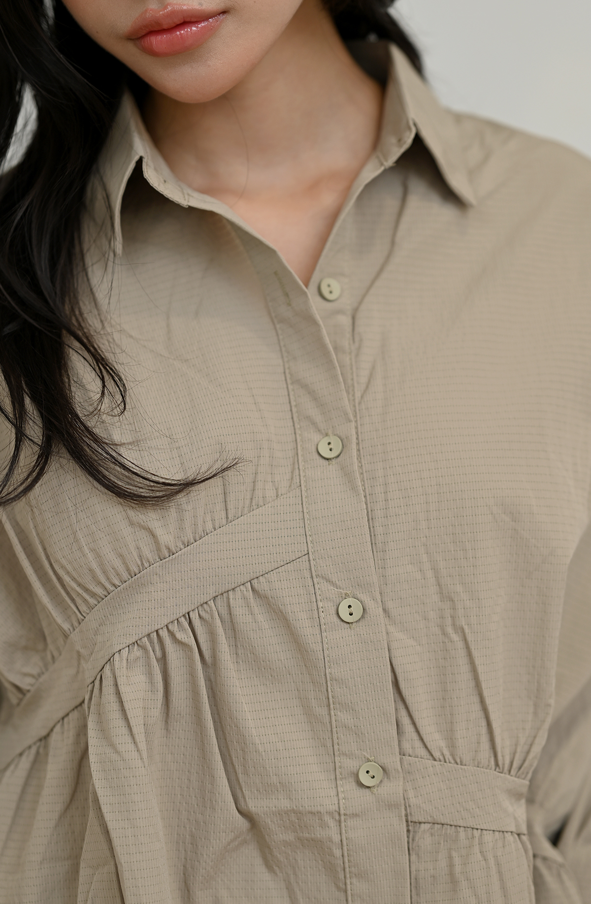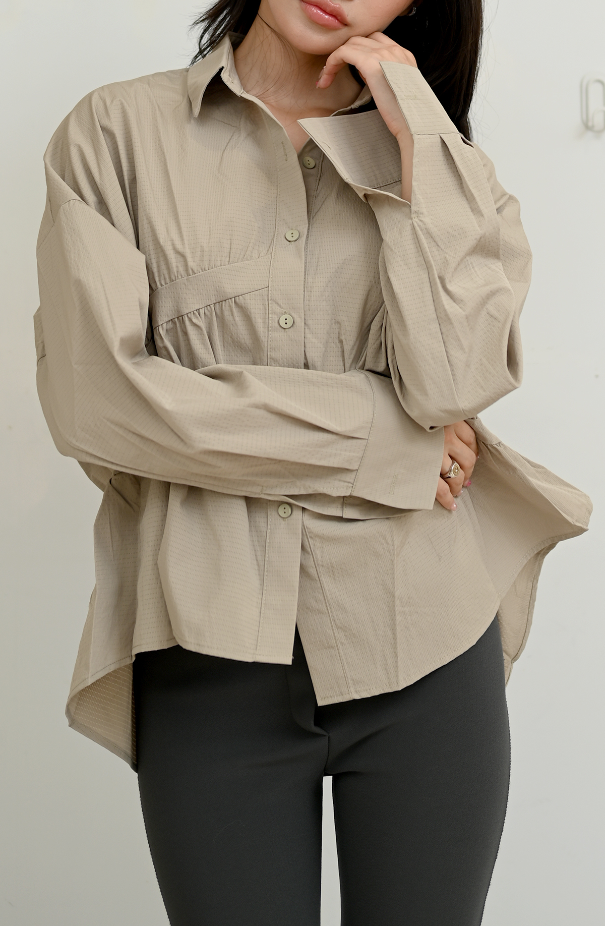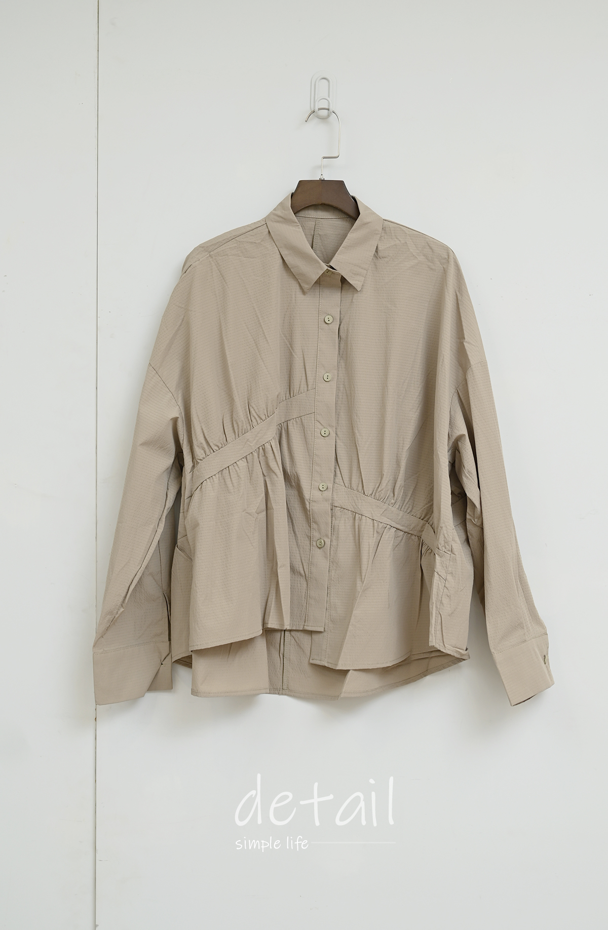 皺褶拼接-寬鬆立領上衣襯衫