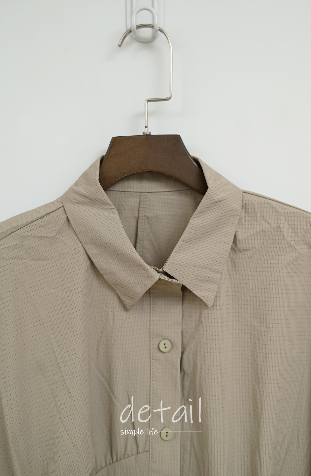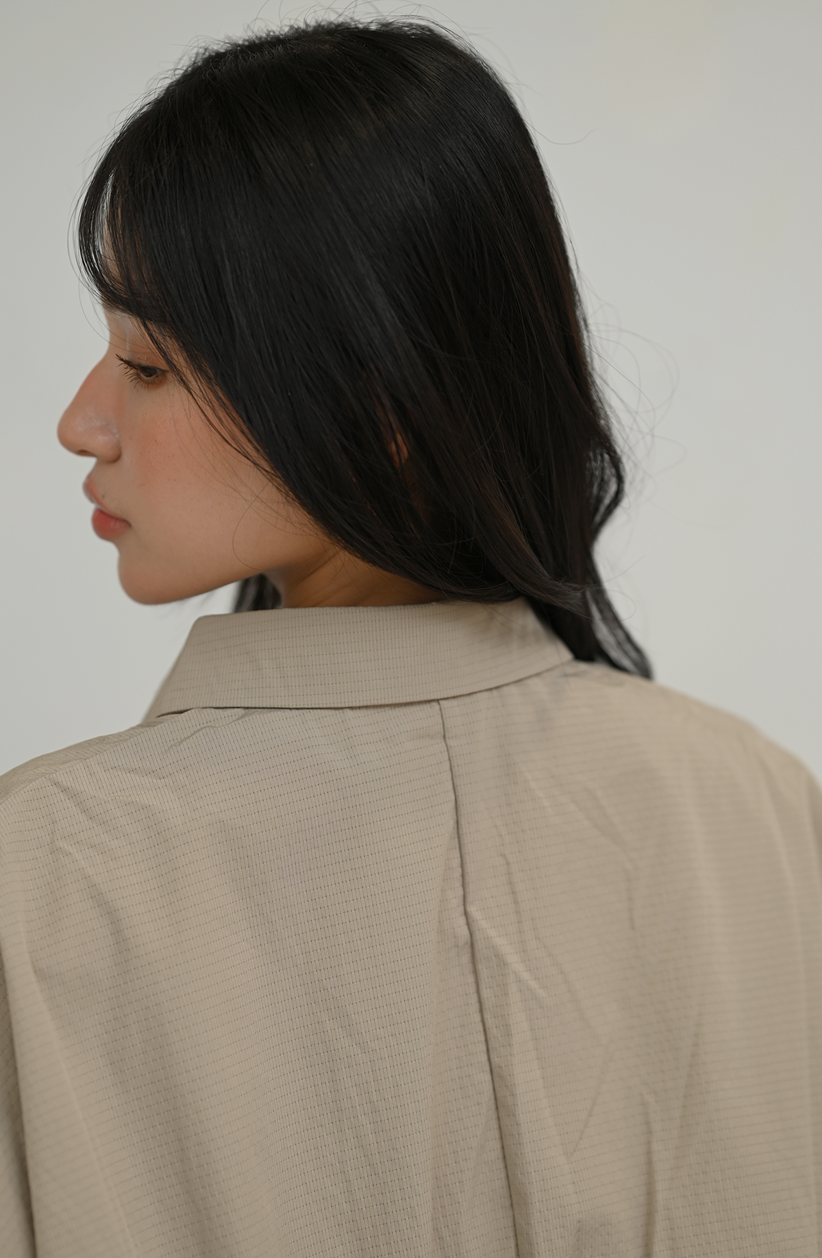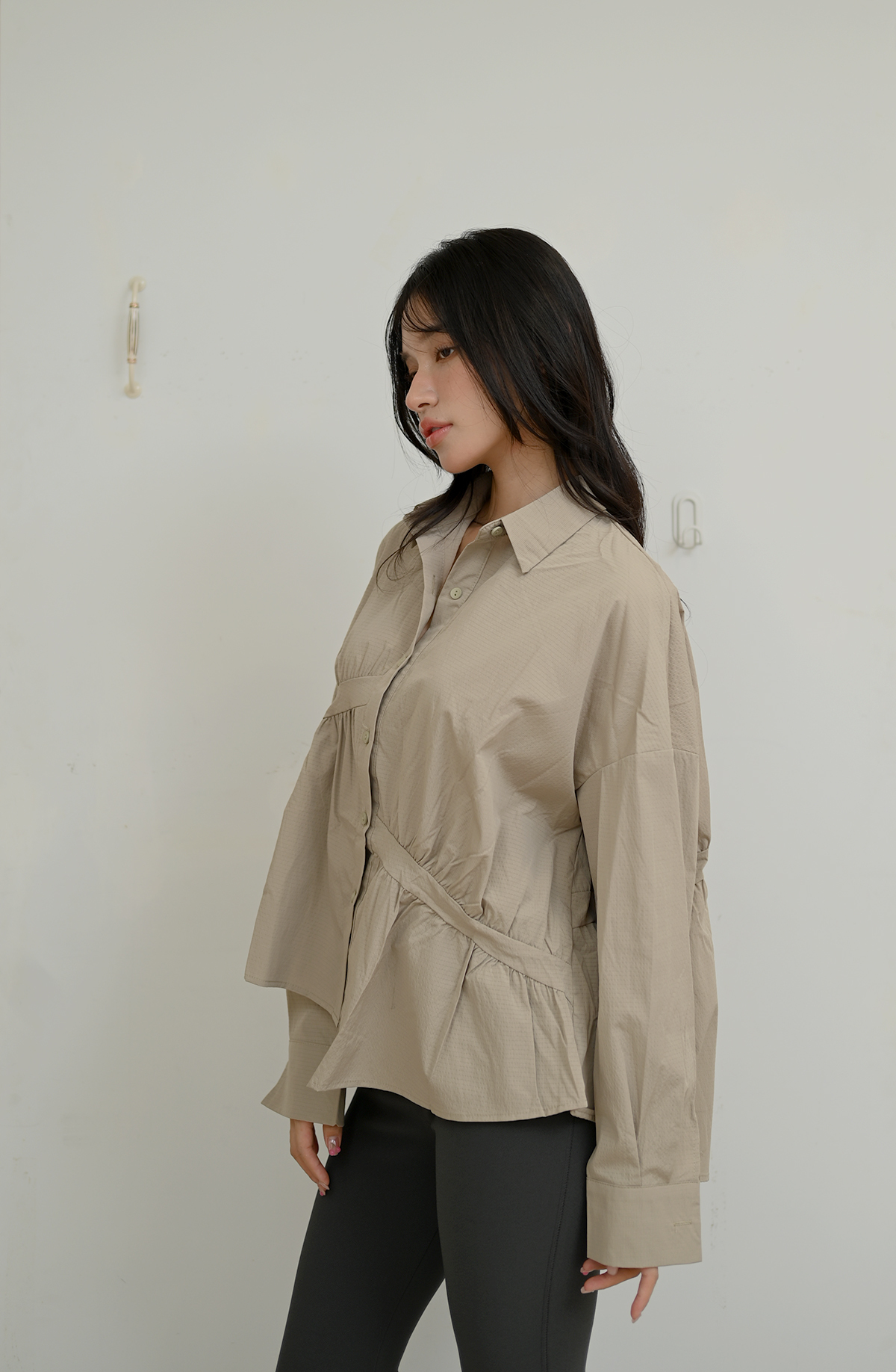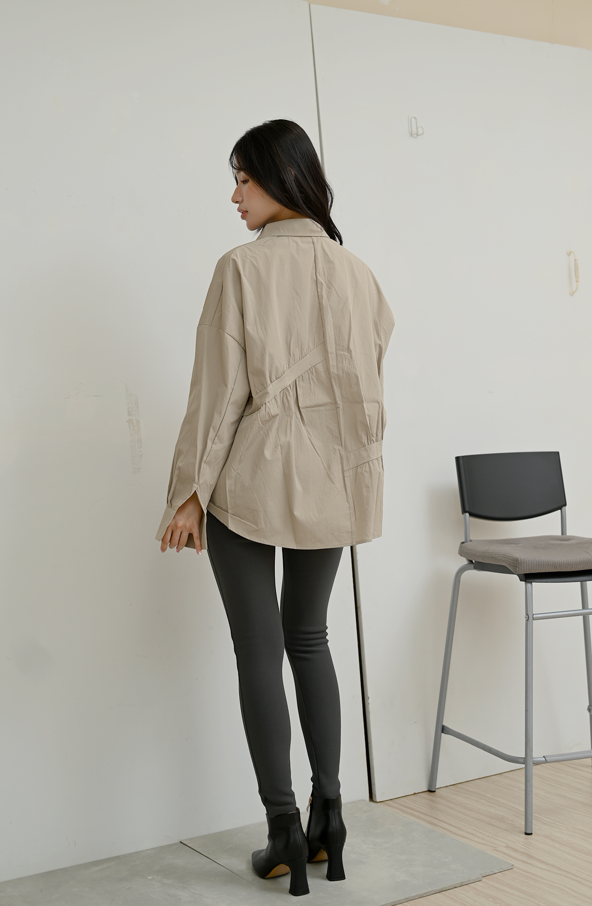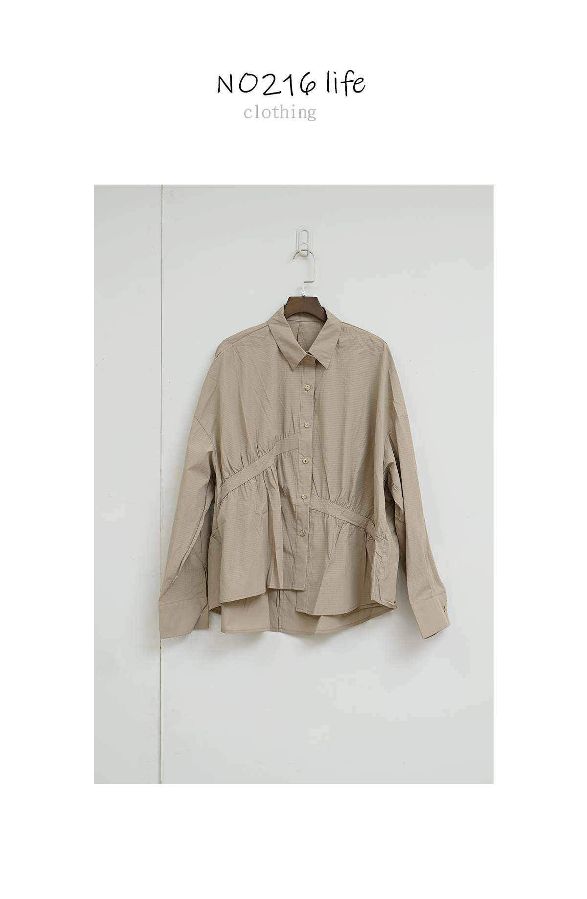 皺褶拼接-寬鬆立領上衣襯衫