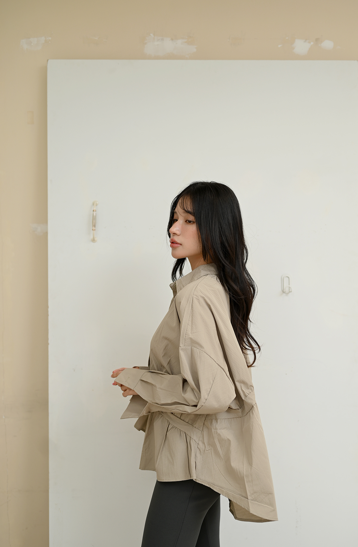 。斜拼寬袖長袖上衣